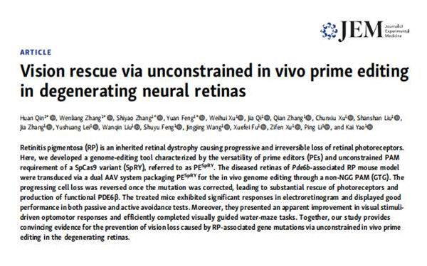3月17日,国际顶级期刊《实验医学杂志》发表姚凯团队的最新科研成果“新型通用基因编辑工具”,世界生物医学界为之侧目。美国科学院院士、眼科专家 Palczewski 教授专门撰文给予高度评价:“该项技术具有重大的临床应用潜力,几乎适用于包括眼部疾病在内的所有已知人类遗传疾病。”