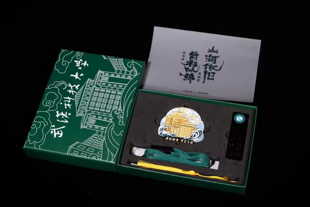 礼盒中印有“愿此去,前程似锦 再相逢,山湖依旧”,表达了学校对毕业生们最美好的祝福和不变的校友情谊。
