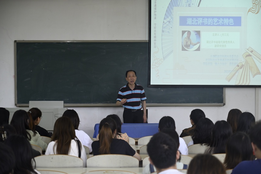 蓝布一盖,醒木一拍,折扇一开,评书起,四座皆静。6月7日,国家级非遗项目湖北评书省级代表性传承人付三元来到Beat365中文官方网站“魅力方块字”的课堂上,开展了以“湖北评书的艺术特色”为主题的讲座,与学生们一同迎接2023“文化和自然遗产日”。