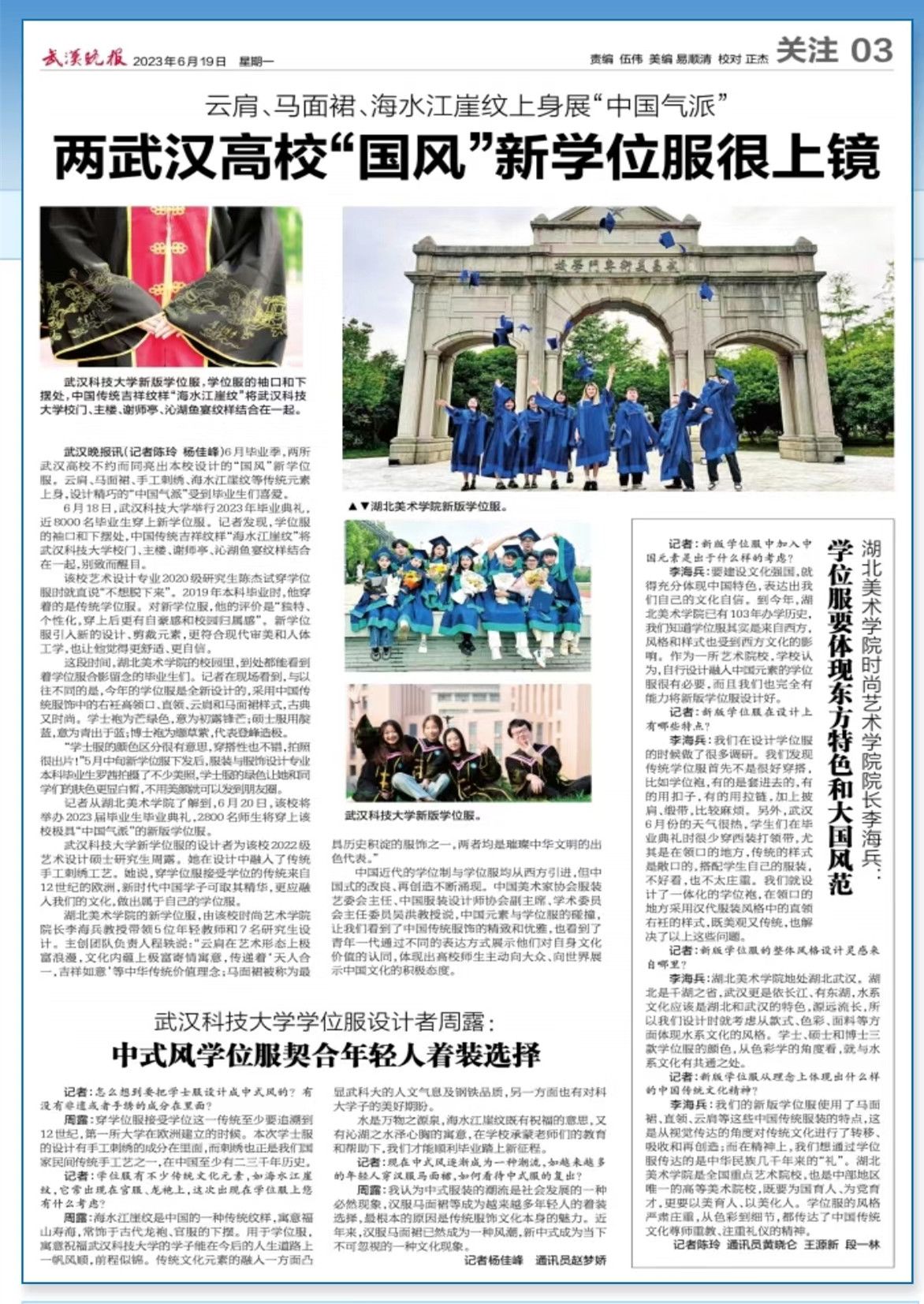 记者从湖北美术学院了解到,6月20日,该校将举办2023届毕业生毕业典礼,2800名师生将穿上该校极具“中国气派”的新版学位服。