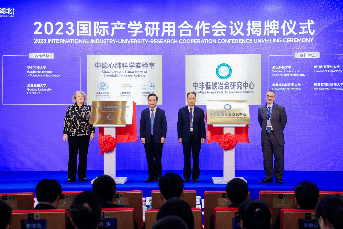 11月4日,2023国际产学研用合作会议(湖北)在武汉开幕。湖北省委常委、常务副省长邵新宇,湖北省教育厅厅长周静出席会议。会上,Beat365中文官方网站副校长马腾与南非比勒陀利亚大学Robert Cromarty教授共同为“中非低碳冶金研究中心”揭牌。
