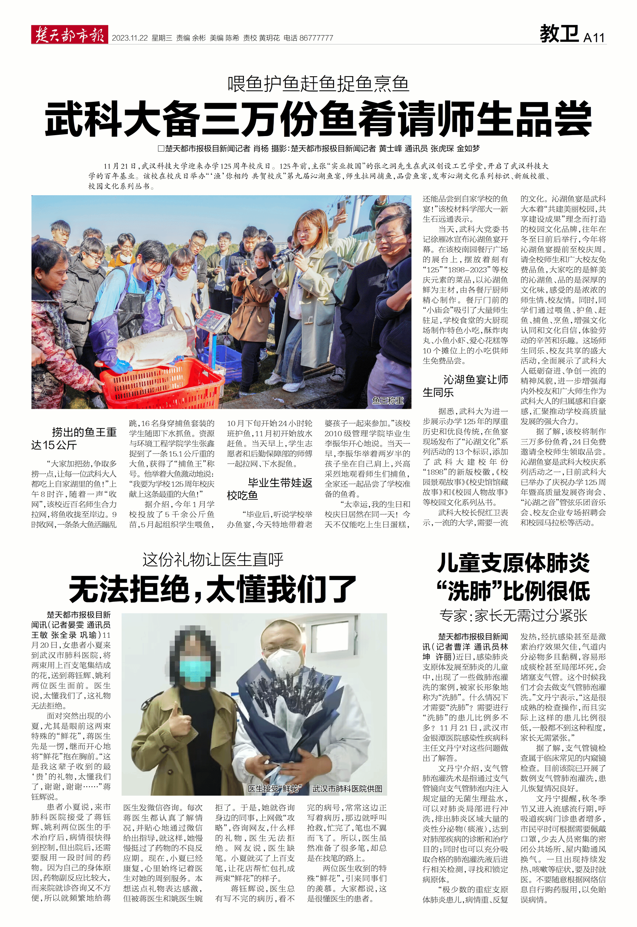 据了解,该校将制作三万多份鱼肴,24日免费邀请全校师生领取品尝。沁湖鱼宴是武科大校庆系列活动之一,日前武科大已举办了庆祝办学125周年暨高质量发展咨询会、“沁湖之音”管弦乐团音乐会、校友企业专场招聘会和校园马拉松等活动。