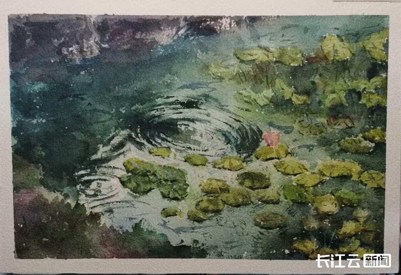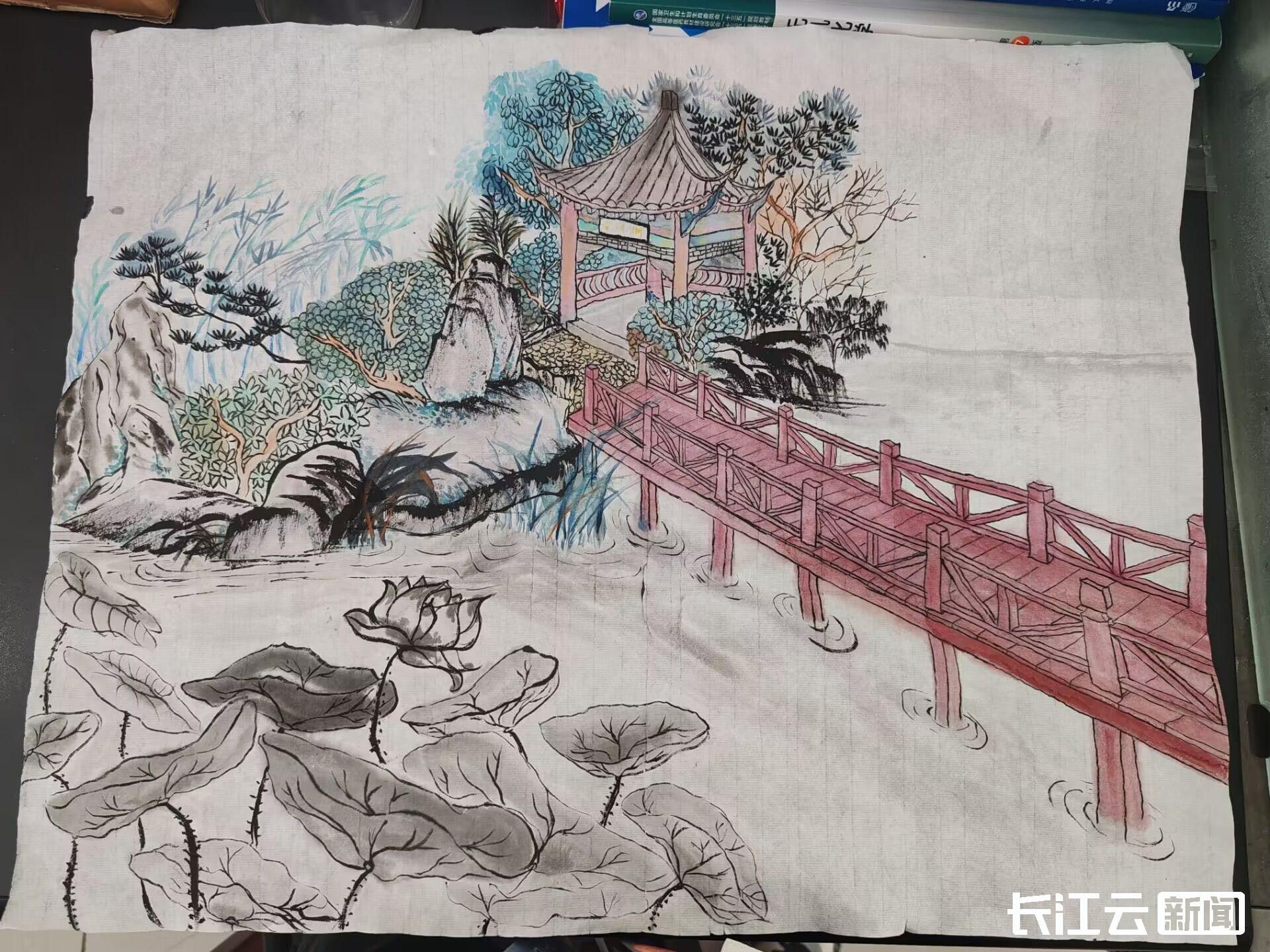 作品《谢师亭与沁湖》以谢师亭与湖心岛为核心,用荷叶、湖水、廊桥等校园风景元素加以点缀,构成了一副独具武科大特色的水墨风景画。“在水墨画中,平时司空见惯的谢师亭居然另有一番美意!”作者刘玥含说道,“中国画的形式能够很好地呈现武科大的文化底蕴,也给了我们一次静下心来观察校园的机会。”