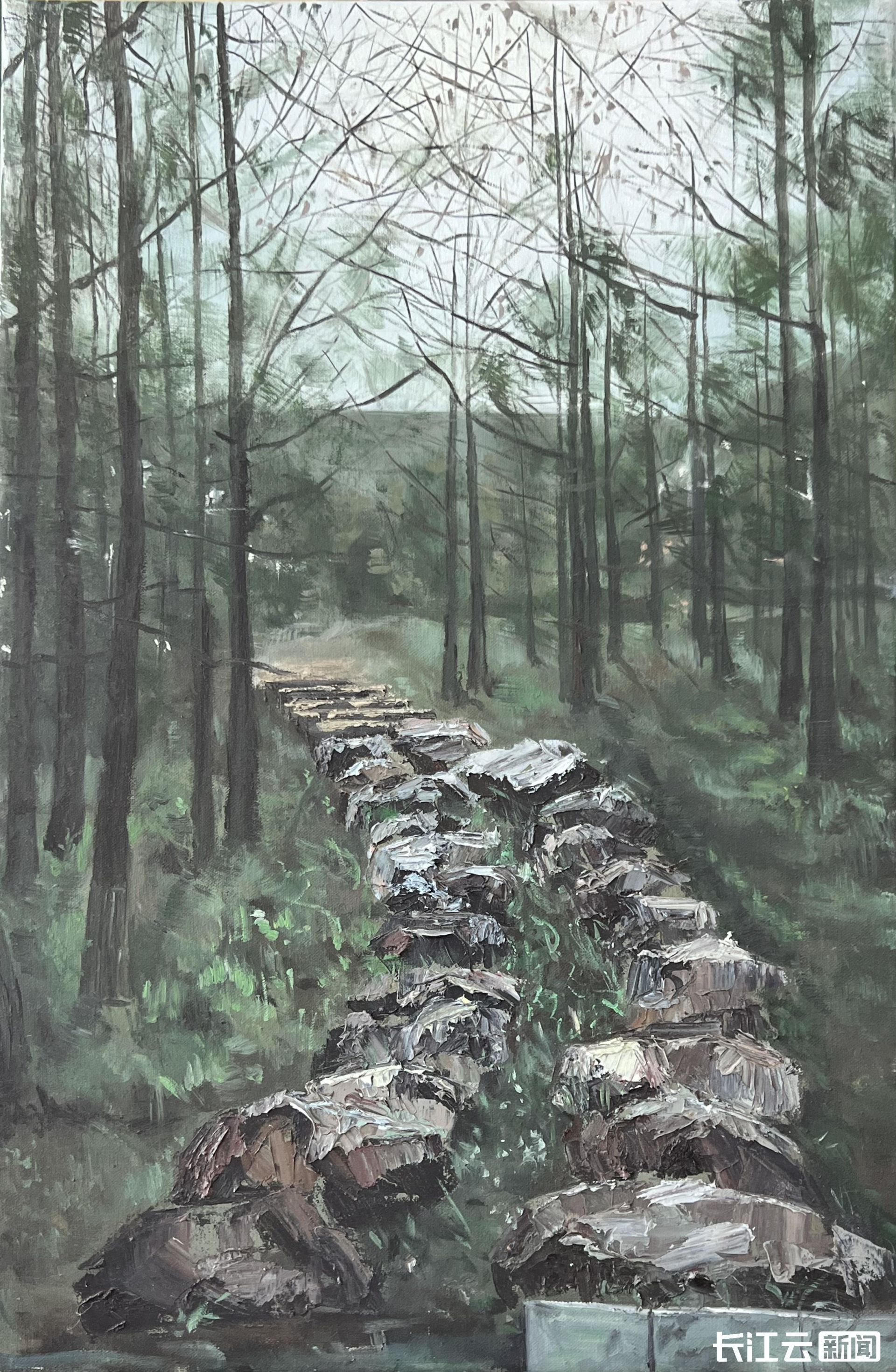 《校园秋末》展现秋未校园角落,运用国画中的白描手法描绘秋末荷叶的残卷与舒展,刻画校园枯树苍老与坚韧。《钢铁精神》结合校史,以“钢”字形为画,通过熔铁入钢的画面展现武科大的钢铁精神。
