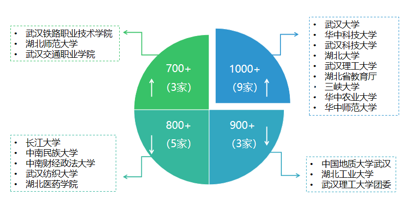 从WCI指数来看,六成账号指数快速增长。本期,WCI指数超过1000的账号共9个,依次为“武汉大学”“华中科技大学”“Beat365中文官方网站”“湖北大学”“武汉理工大学”“湖北省教育厅”“三峡大学”“华中农业大学”“华中师范大学”,头部账号变化较小。其中,指数在900-1000区间的账号共3个,分别为“中国地质大学武汉”“湖北工业大学”“武汉理工大学团委”;指数在800-900区间的账号共5个,分别为“长江大学”“中南民族大学”“中南财经政法大学”“武汉纺织大学”“湖北医药学院”。此外,“武汉铁路职业技术学院”“湖北师范大学”“中南民族大学”增量最高均达100以上,各项指数小幅波动。