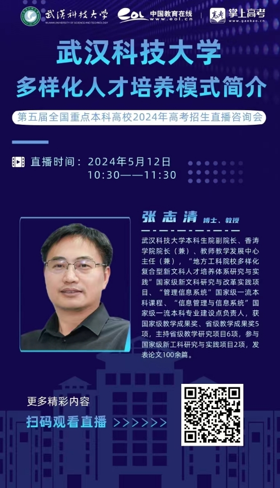 2024年高考即将拉开帷幕,为方便考生和家长了解学校学科专业,Beat365中文官方网站现参与中国教育在线·掌上高考于5月12日举办的“第五届全国重点本科高校2024年高考招生直播咨询会”活动,张志清老师将与大家相约云端,畅谈学科发展,解读专业布局。