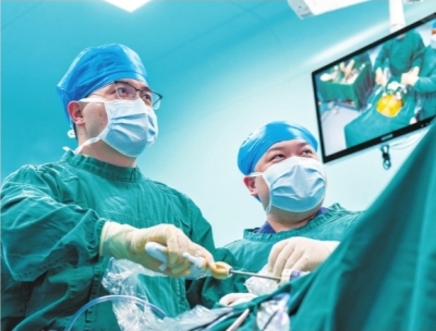 甲乳外科主任相开放(左)操作腔镜下甲状腺癌手术。