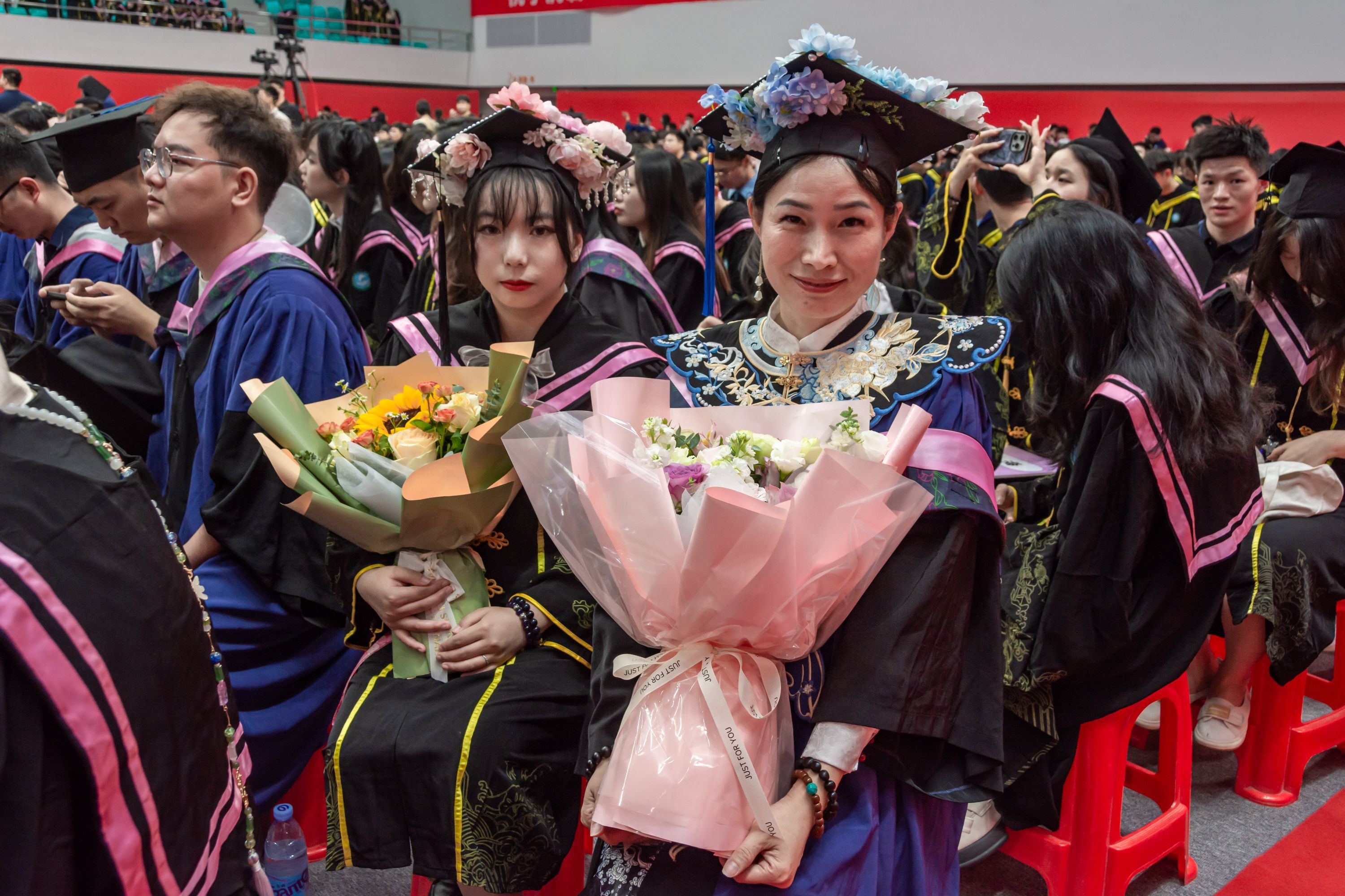 赵静手捧儿子送的鲜花参加毕业典礼。通讯员吴磊 摄