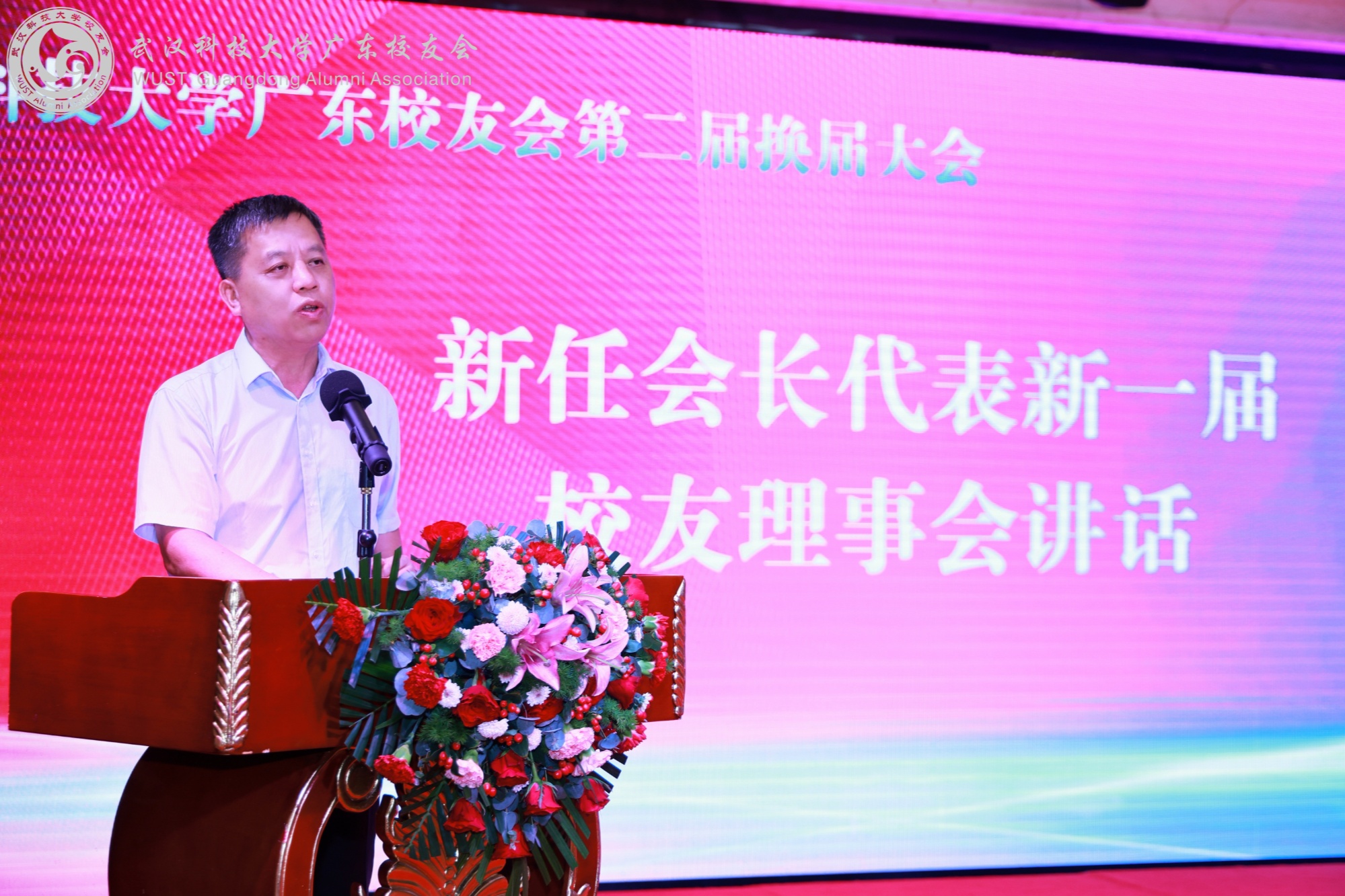 新一届理事会会长李烈军代表广东校友会第二届理事会致辞。他表示,广东校友会成功换届选举是一个新的开端,新一届理事会将不负众望,要积极团结广东校友,满腔热情地组织好校友,做好校友与校友之间、校友与母校之间的桥梁,通过学术研讨、文化交流、项目合作等多元化活动,服务好校友、服务好母校、服务好粤港澳大湾区高质量发展,主动融入本地经济、文化、社会、特别是科技创新的方方面面,积极投身到南粤大地处处充满生机的“百千万工程”中去,充分发挥武科大校友的“钢铁品质”,推动母校与校友共同发展,不断深化鄂粤两省合作,加强两地联动,通过融合发展成为高质量发展的新动能,为大湾区的创新发展贡献智慧和力量,为国家作贡献,为社会创造财富和价值,为母校增光添彩。
