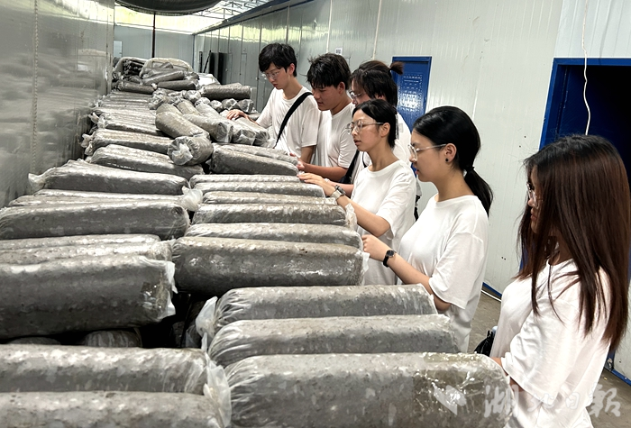 实践成员们来到车间,通过观察工人工作,了解香菇从点菌到制成成品的过程,围绕该地香菇产业利用得天独厚的自然条件和先进的生产技术,结合高效率的生产线形成的独特的联农带农机制展开了深度的实地调查探究。