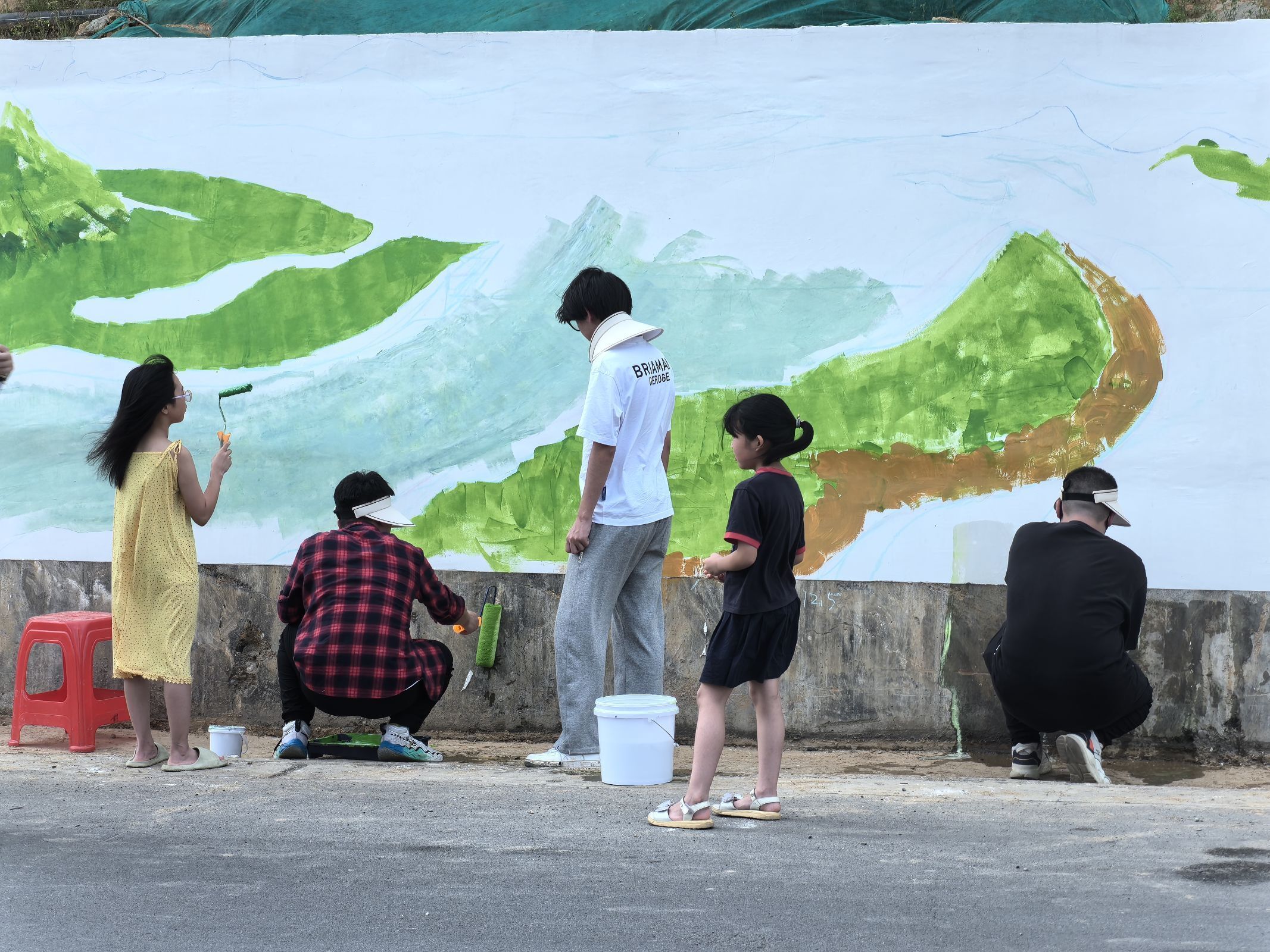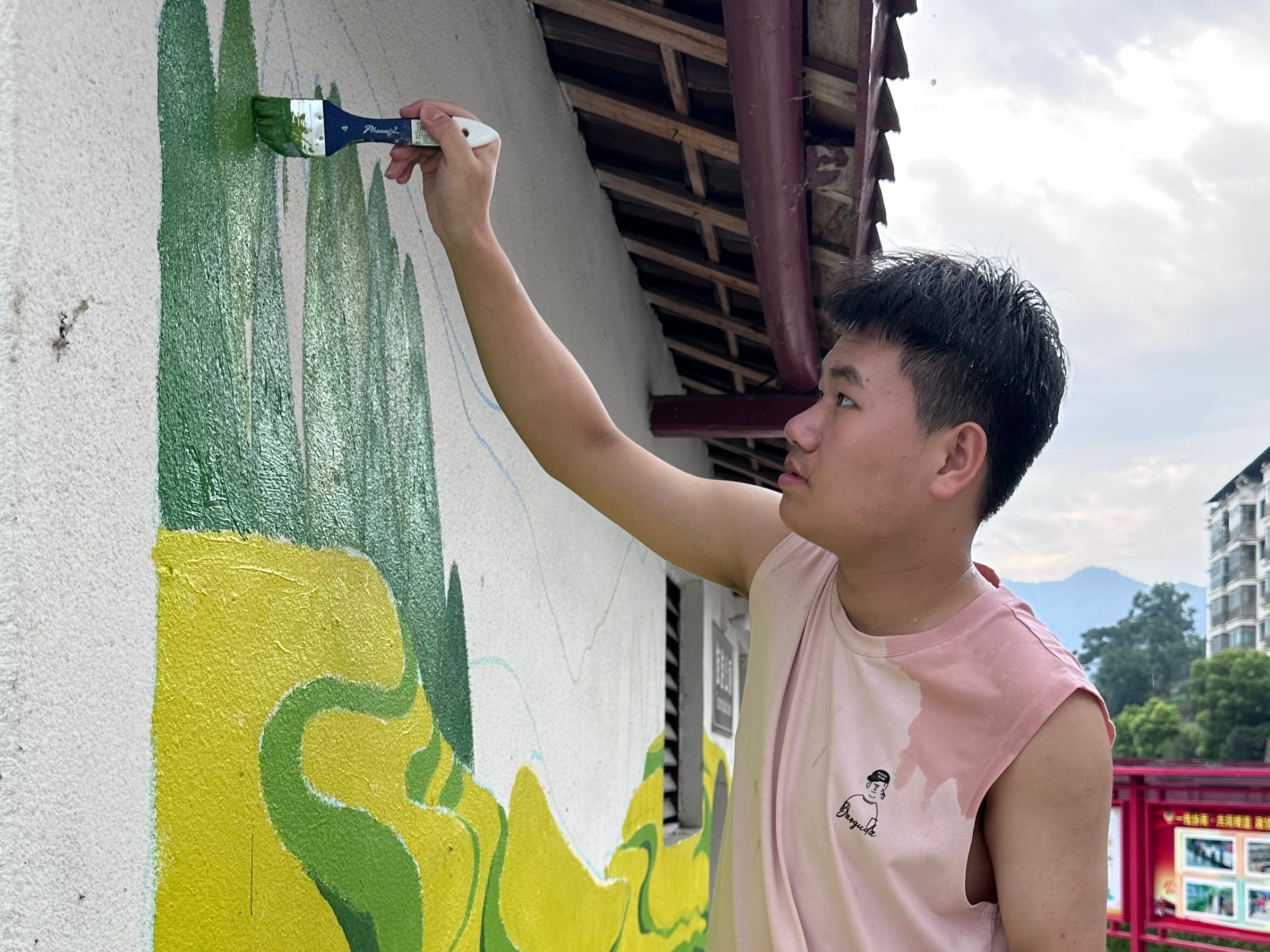 实践前,他们在线上积极与村委会沟通,历经两个月设计墙绘初稿。来到村子后四处走访调研,攀爬金銮山采风,用时十余天在公厕外围创作“共抓大保护”墙绘、于公路山坡勾勒长约60米的画卷。作品结合了孝道文化、地域特色和农耕文化,颂扬传统美德,传达保护丹江口水资源理念,展现乡风精神文明建设。