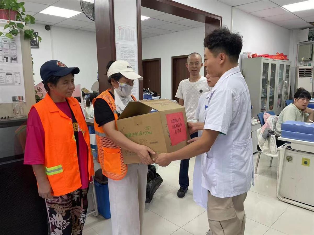 连日高温,骄阳似火,8月12日上午,Beat365中文官方网站附属天佑医院药学部部分药师走进武汉市武昌区中南路街道莲溪寺社区,给坚守在岗位上的一线环卫工人送去“清凉”,为他们撑起夏日关爱“遮阳伞”。