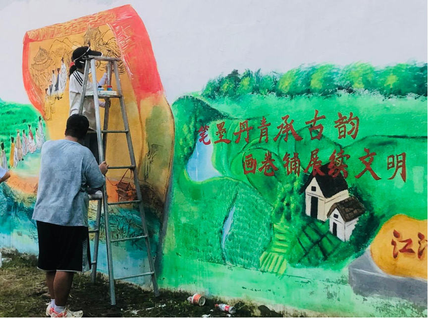 风力发电机、光伏发电站、古风画卷、稻田丰收……各种场景在白墙上一一呈现。在江河村,支教团以“中国历代绘画大系”和“青春手绘美丽乡村”为主题开展墙绘活动,让村民们广泛参与,提出他们对乡村建设的建议,用画笔传承优秀传统文化、“勾勒”和美乡村新画卷,为村容村貌改善提升添彩助力。