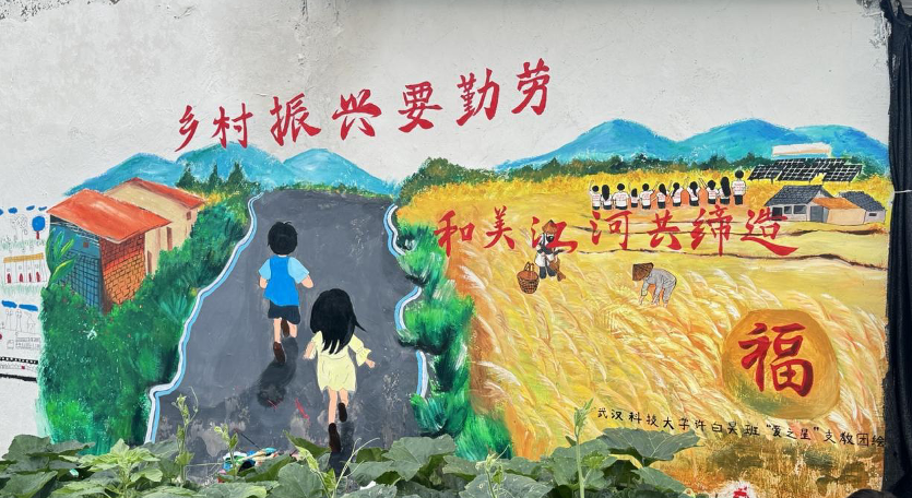 支教团成员们一一收集村民的意见,将江河村的标志建筑和景象都留在了墙上。乡间田野里,携手奔跑的儿童们、辛勤劳作的农民、宽敞洁净的柏油马路、远处高耸的风力发电机和田边成规模的光伏发电设备。墙绘上满是乡村振兴的共建成果,支教团为墙绘题上标语“乡村振兴要勤劳,和美江河共缔造”。(作者:王宇)