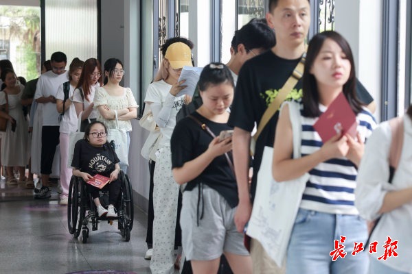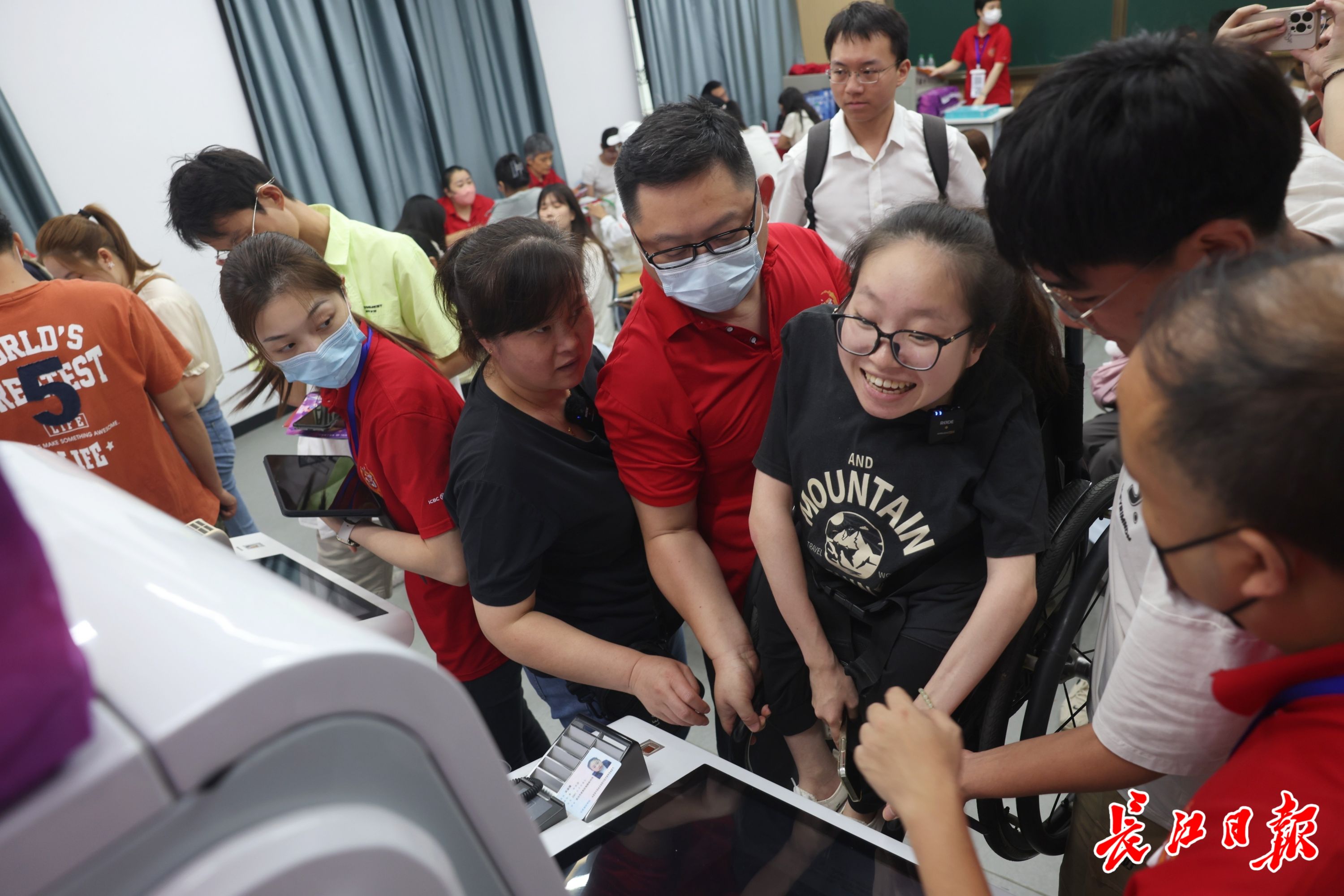 8月28日中午12点,关淑婧和妈妈叶小红到达华中农业大学外国语学院,在志愿者的帮助下办理入学手续。在人像采集环节,轮椅上的她达不到摄像头的高度,两名志愿者师生一把将轮椅抬起,她的笑容被仪器精准录入。