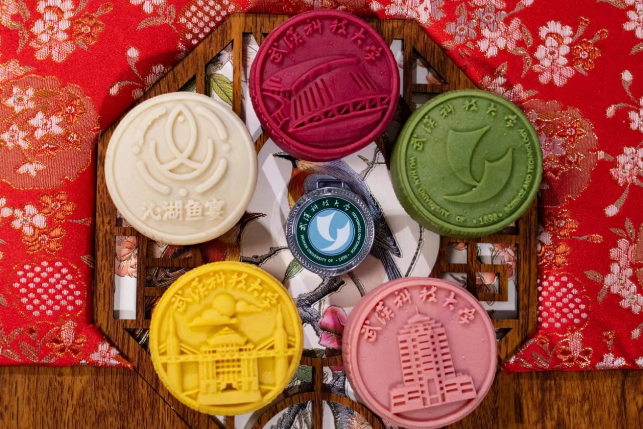 绿色的“校徽月饼”代表生机,寓意学子在知识的海洋里乘风破浪。“沁湖鱼宴月饼”选用的白色是为了贴合椰香藜麦的口味,设计灵感则是来自每年入学季武科大“沁湖鱼宴”活动的视觉标识,预告即将到来的第十届沁湖鱼宴。除此还有“黄家湖校区校门”月饼、“沁湖体育馆”月饼以及“青山校区主楼”月饼,均融入了现代化设计理念。
