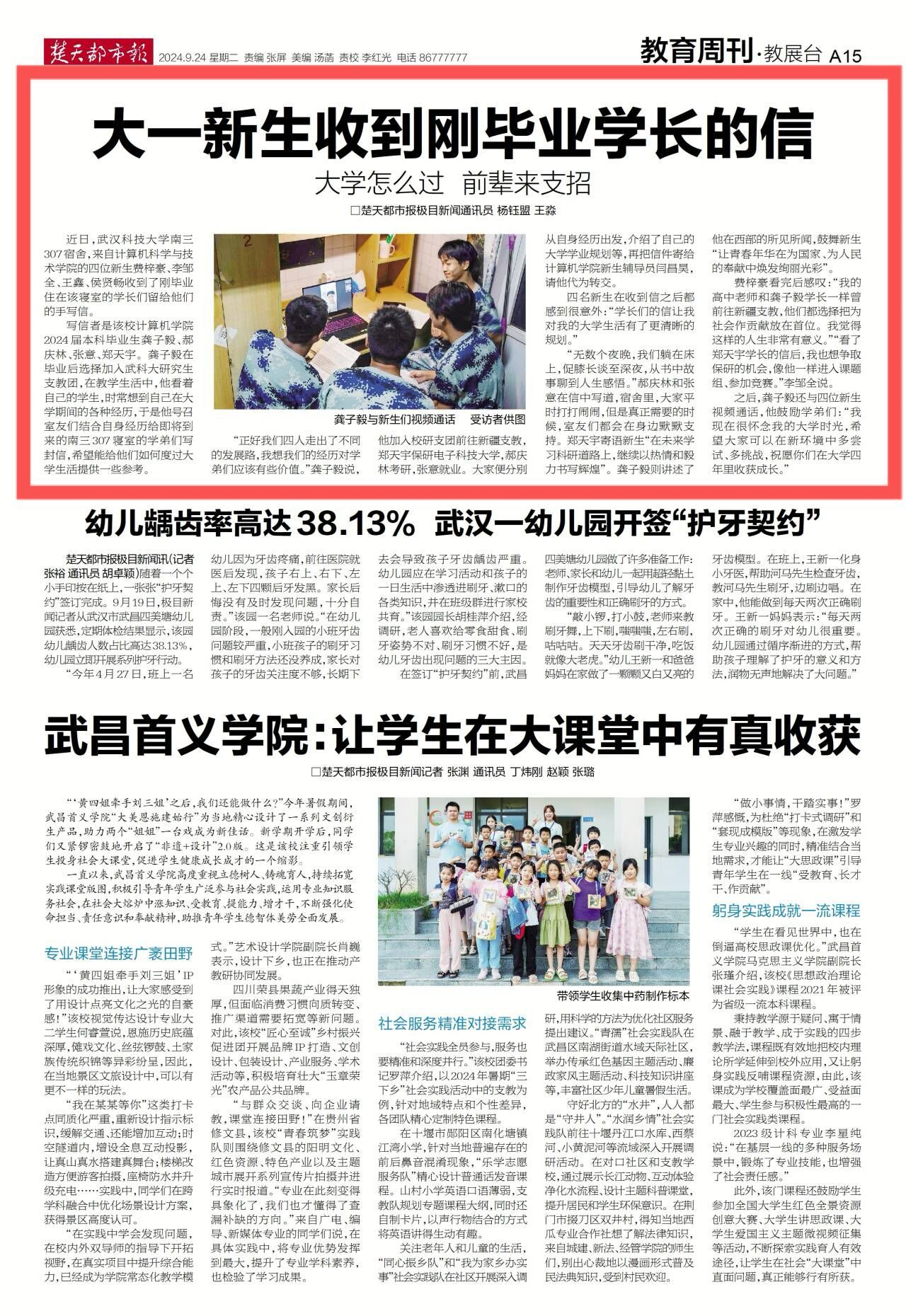 费梓豪看完后感叹:“我的高中老师和龚子毅学长一样曾前往新疆支教,他们都选择把为社会作贡献放在首位。我觉得这样的人生非常有意义。”“看了郑天宇学长的信后,我也想争取保研的机会,像他一样进入课题组、参加竞赛。”李邹全说。