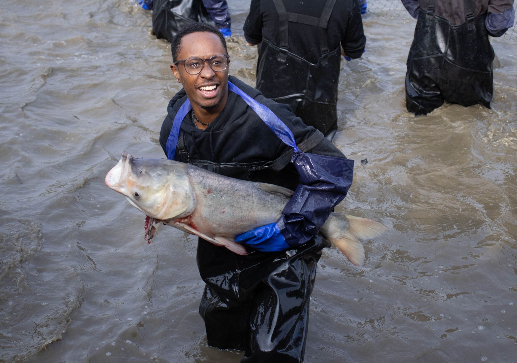 赞比亚留学生Chishimba Mutale已连续四年吃到了“沁湖鱼宴”的免费鱼肴,这是他第一次参与到拉网捕鱼的环节,“特别激动!感恩学校给我们这样的机会体验!”