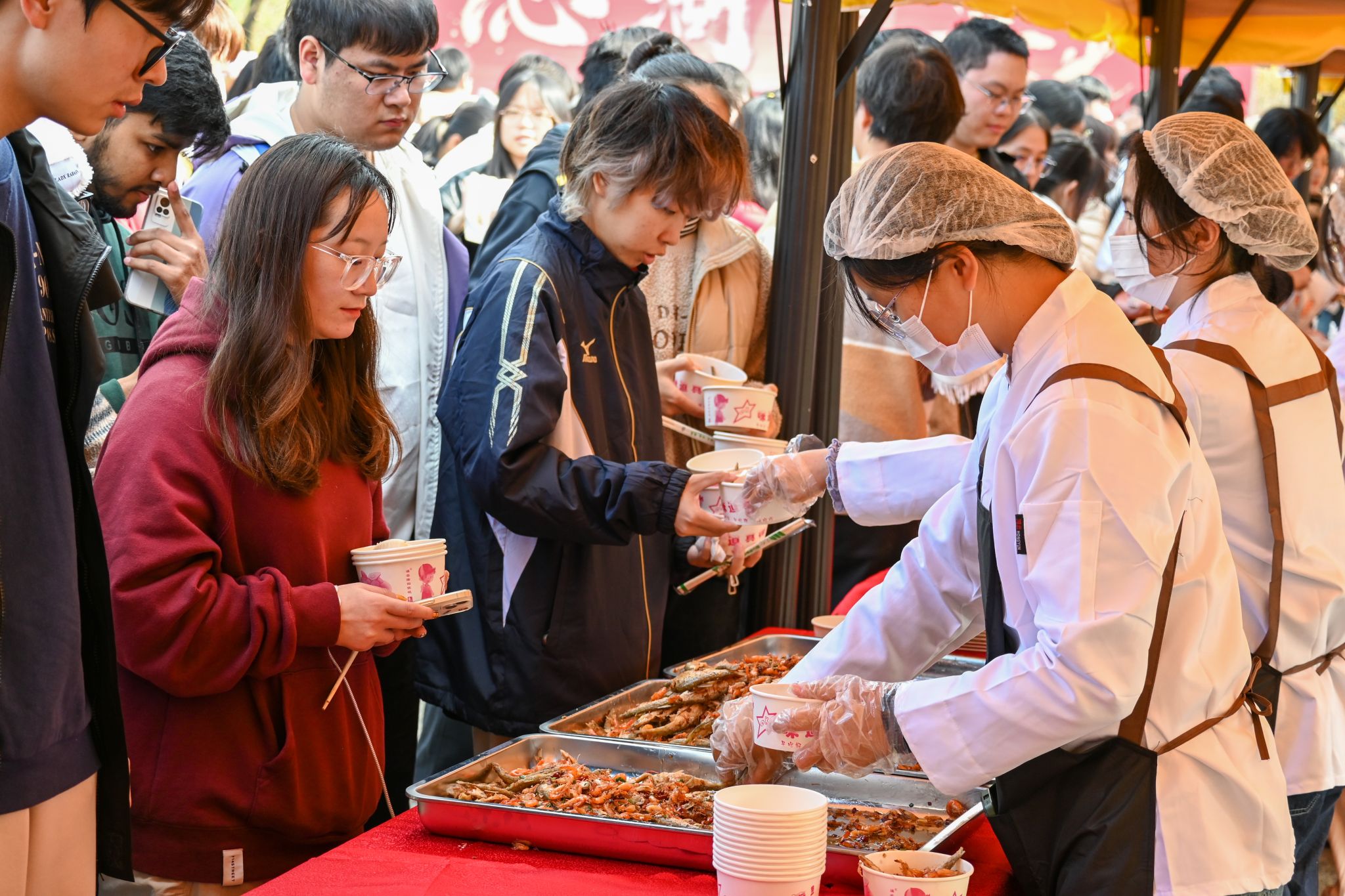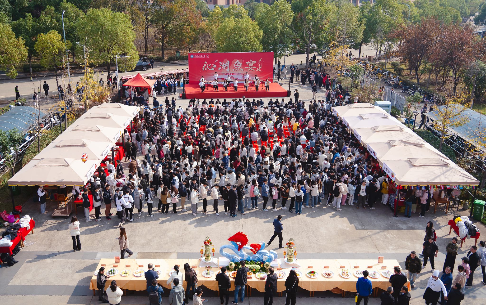 “哇,那个看起来好好吃!”师生们在南园餐厅门前排起了长队,走近一看,原来是各类菜肴展示和特色小吃组成的小庙会。来自学校各个餐厅的大厨们各显神通,以新鲜的沁湖鱼为主材,精心烹制了21道融入126周年校庆元素的菜品,如菌临天下山河秀、龙腾龙跃气昂扬、豪情万丈定乾坤等。同时,学校后勤保障部准备了10个摊位,在庙会上供应各种美食,包括小鱼小虾、米酒汤圆、爱心花糕等。