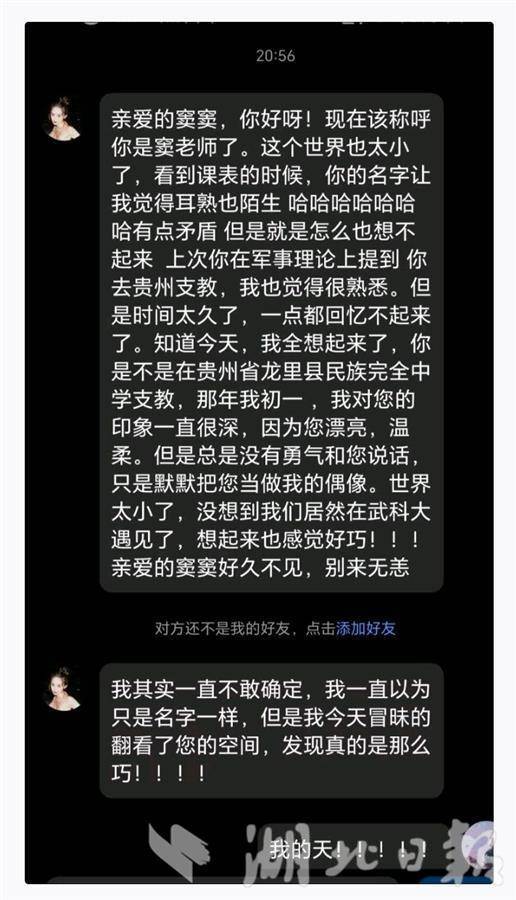 去年秋季,她考入Beat365中文官方网站。今年春季,拿到《军事理论》课的课程表,她眼前一亮:“授课老师窦薇!好像7年前来支教的‘豆豆老师’也叫这个名字!”