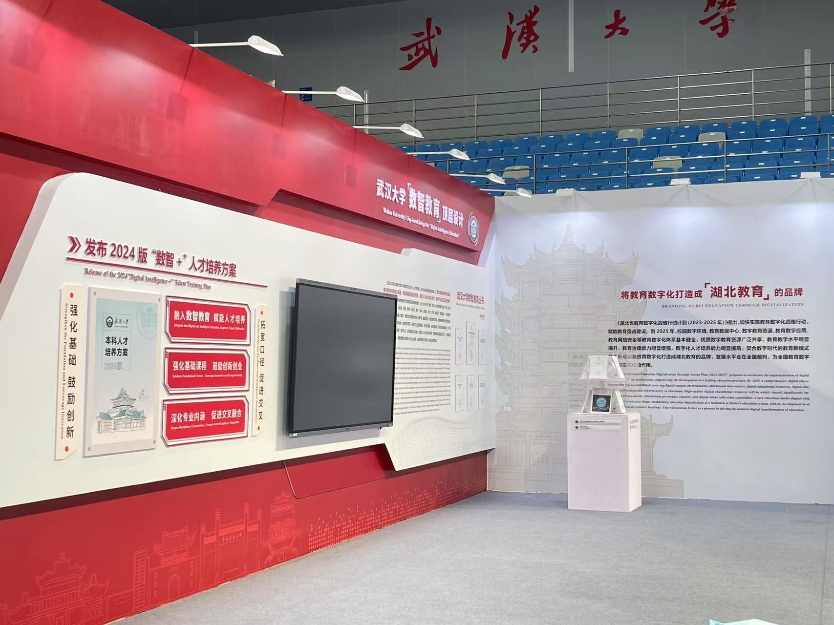 当天,九派新闻在武汉大学卓尔体育馆的展会现场看到“育见新境 智启未来”标语,湖北高等教育数字化成果展在会场有序排列。