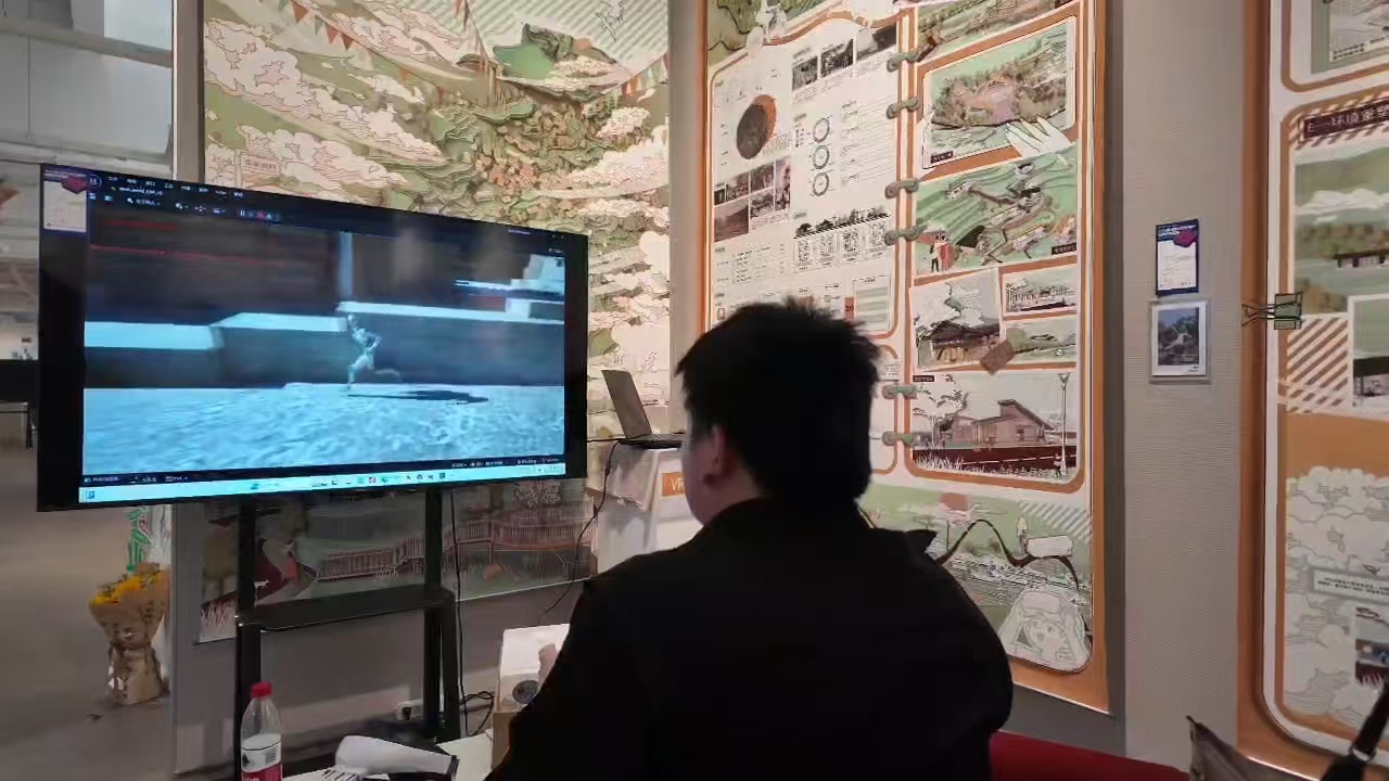 偶然接触的一次VR游戏给了陈思灵感,她自学编程语言将测绘舍米湖村的数据以游戏建模的形式还原,跨学科设计了VR交互游戏《“戏”游米湖》。在游戏中陈思真实还原了土家族吊脚楼建筑“排扇”“飞檐”等结构,随着游戏指引与交互,玩家将身临其境地在舍米湖村畅游,感受土家族独特的建筑风格与民族文化。听说了陈思的作品后,舍米湖所在地的镇长还与师生相约来观展,并考虑将成果应用到当地的游客服务大厅。