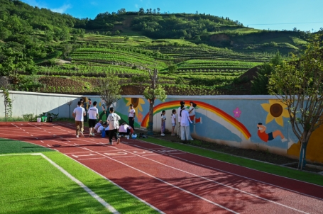 团队成员孙然对她在实地调研石庙子村既有墙绘成果后表示:“学校连续3年的美丽乡村缔造工作成果在当地落地,与地方优美环境和谐相融,主题鲜明,为我们此次墙绘工作提供了宝贵借鉴。”基于扎实调研和结合高扁小学校园环境及教育需求,团队师生以“运动阳光”与“素质教育”为主题,精心设计两套墙绘方案。师生们顶烈日、战酷暑,历时7天完成90平方米的墙面绘制,让石庙村小学经历了一场“颜值革命”,用艺术专业实践回应乡村文化建设需求。