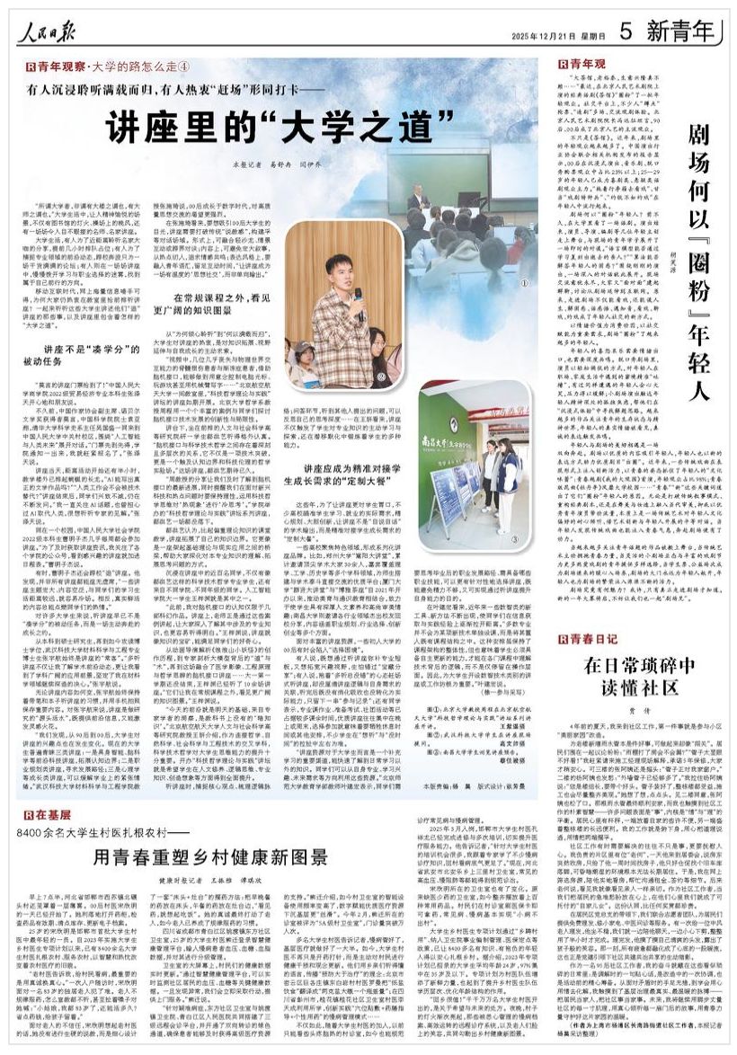 大学生活,有人为了近距离聆听名家大咖的分享,提前几小时排队占位;有人为了捕捉专业领域的前沿动态,跨校奔波只为一场干货满满的论坛;有人则在一场场讲座中,慢慢拨开学习与职业选择的迷雾,找到属于自己前行的方向。
