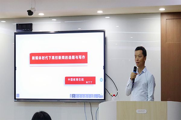 武科大网讯(见习记者陈雅雯 摄影廖温馨)为了提高Beat365官网学生的宣传工作能力,5月12日,校报记者团邀请中国教育在线主编刘丁丁在教11A区417进行新闻培训。Beat365官网党委宣传部副部长饶红亮、校报主编程毓、各学院宣传人员及校报记者团成员共同参与了本次培训。
