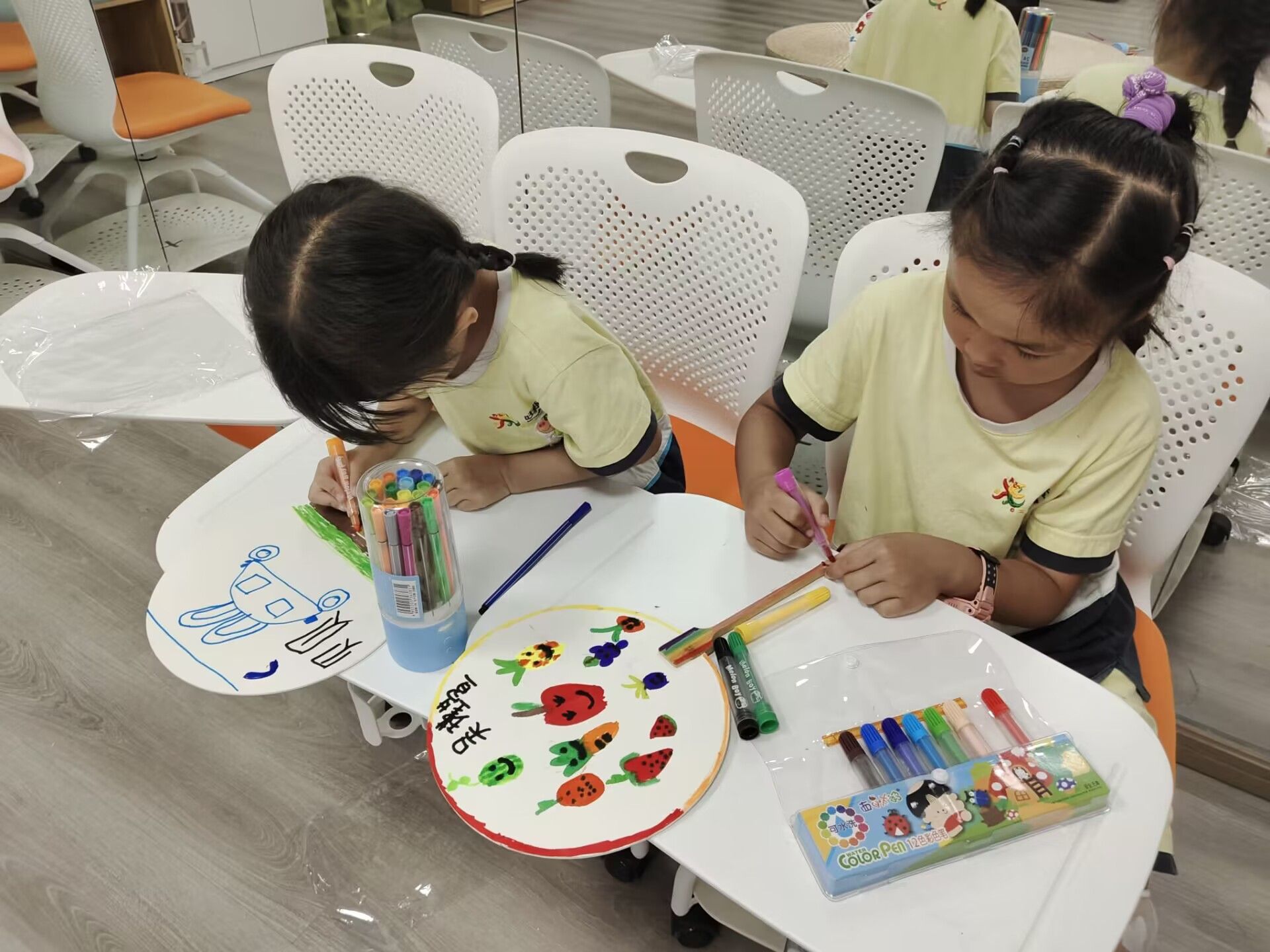 小朋友玥玥的妈妈为学校后勤部教职工,特意带孩子过来体验趣味活动。“我画了蓝天白云还有房子呢!”“我喜欢粉红色,我要把这只企鹅也涂成粉色!”玥玥和君君来自同一个幼儿园,正一起专注地画着扇面画。她们兴趣盎然地用画笔画着自己喜欢的图案,不一会儿,两幅颜色绚丽的扇面画便画好了。活动过程中,玥玥妈妈一直在旁边拍照拍视频,她高兴地说:“今天的活动特别丰富,小朋友们一起玩乐很热闹,我想记录下这些快乐时刻。”