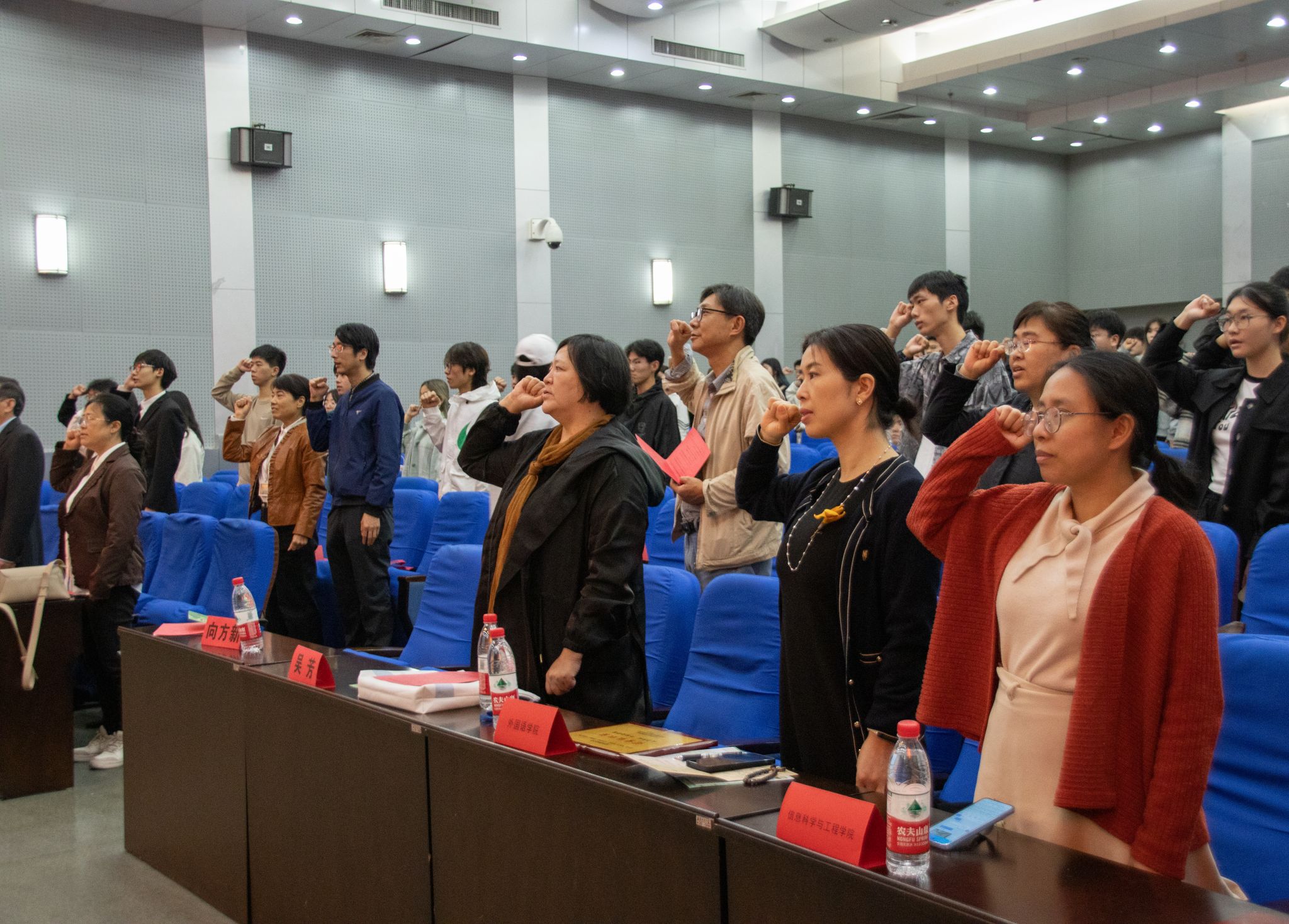 第十五届图书馆青年志愿者服务队队长华航介绍了他接任图青队后的思考以及对今后工作的展望。十五届青山校区图书馆志愿者服务队队长肖琦和新志愿者代表陈凯琴也表示了他们对图书馆志愿服务的认知和感悟。陈凯琴带领全体参会志愿者,集体宣誓,表达志愿者们为志愿服务活动奉献的决心。