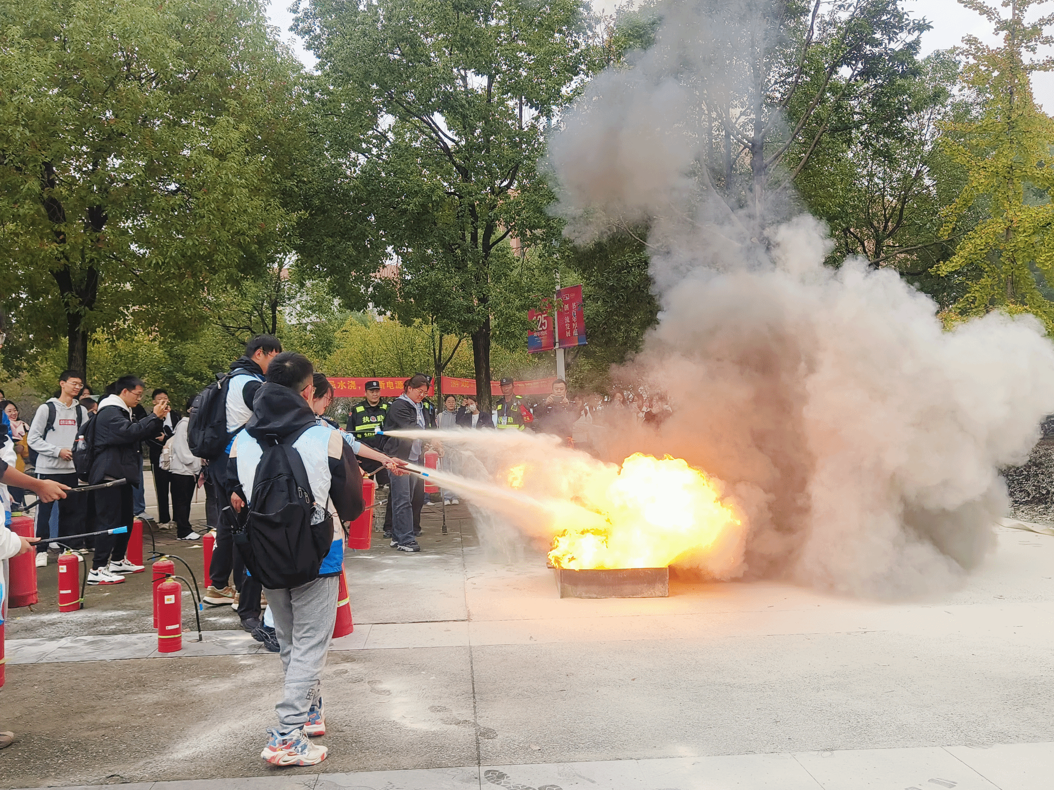 随后,段晓栋进行了干粉灭火器的现场演示和讲解,并邀请现场学生实操。在实操过程中段晓栋手把手指导学生亲自操作灭火器对准火焰根部快速扑灭大火,吸引了大批学生围观。