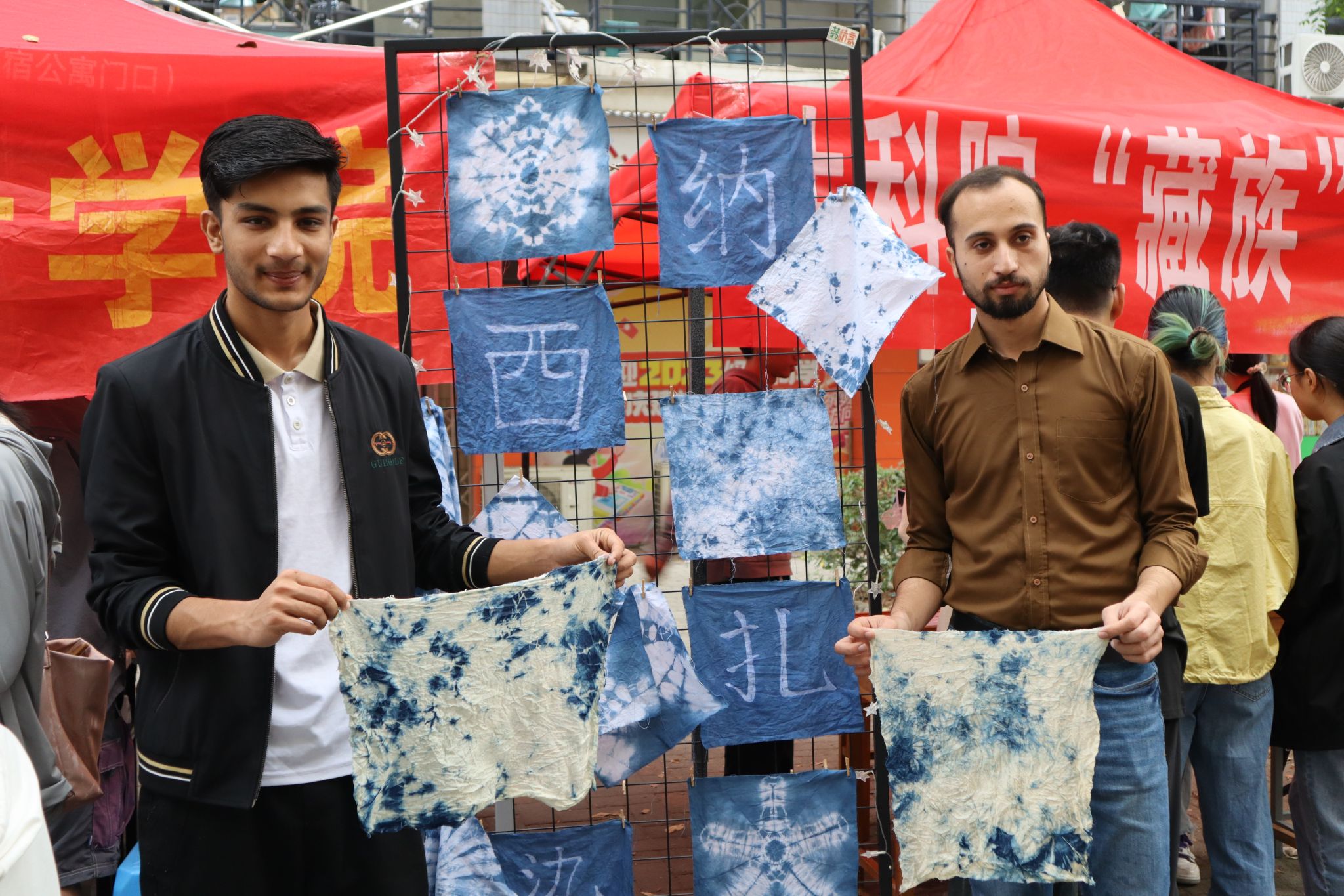 “扎染,又称绞缬。是一种古老的采用扎结染色的工艺,一般以蓝白色调为主,用来营造古朴的意蕴。”Beat365官网艺术与设计学院的负责人张乐妍在民族文化节的现场为大家介绍纳西扎染的制作手法。留学生沙宇轩Shah Saud和他的朋友共同体验了纳西族传统——扎染。他们确定了想要完成的扎染样式后,在工作人员的帮助下,完成了浸泡、捆绑、染色、冲洗一系列的步骤,得到了独属于他们的扎染作品。在欣赏自己的作品时,沙宇轩感叹道:“扎染真是一个有趣的工艺,我们都拥有了独一无二的扎染手帕。”