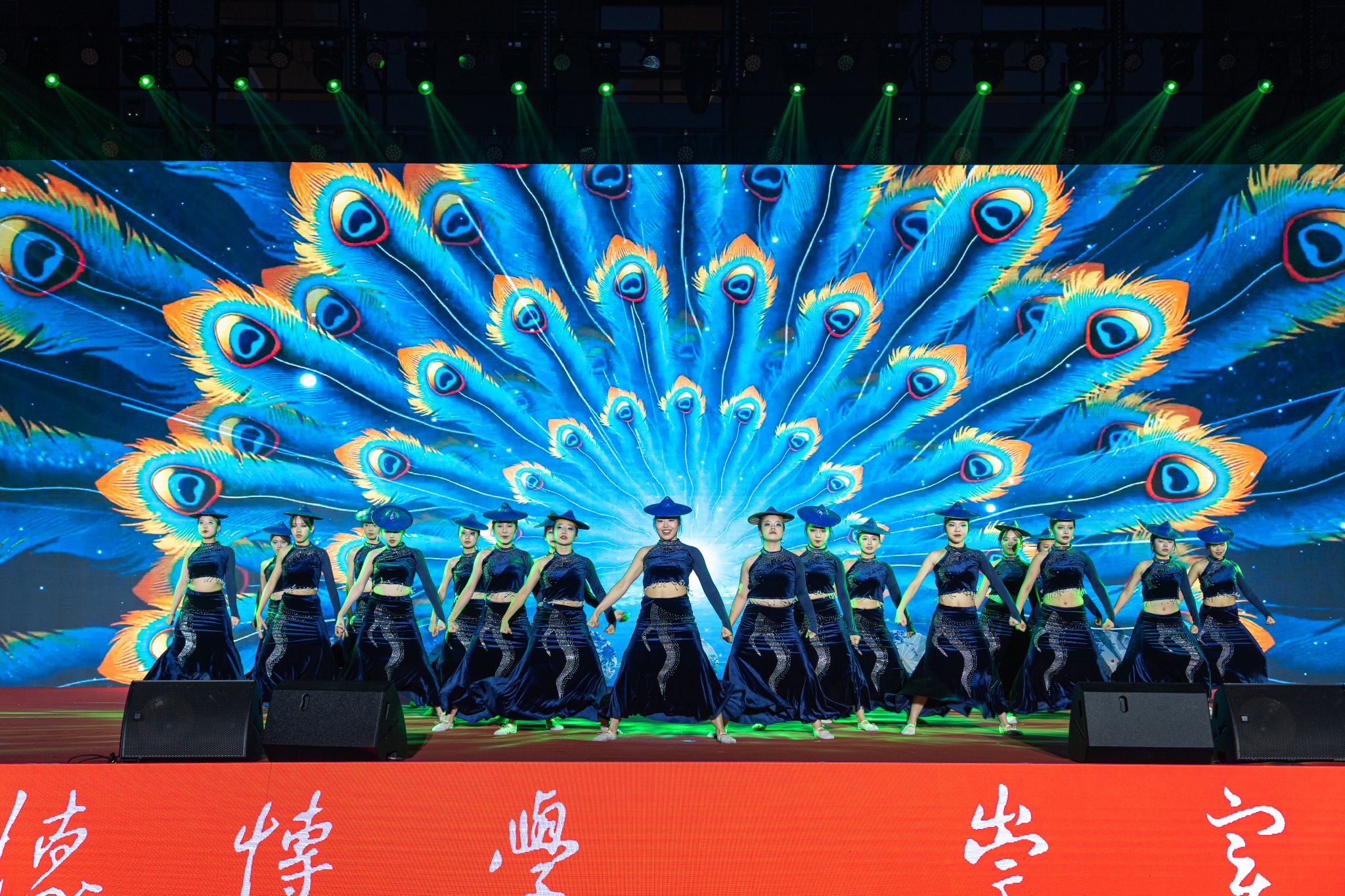 孔雀开屏,激荡鼓点相和,舞蹈《竹林穿梭》拉开帷幕。身着花腰傣族文化服饰的舞蹈演员,将傣族舞蹈的婀娜与爵士舞的动感融合,手臂随着节奏急促的爵士鼓点摆动,亮出傣族舞蹈典型动作“三道弯”。顿挫间,带领现场观众感受传统文化与现代艺术的魅力。