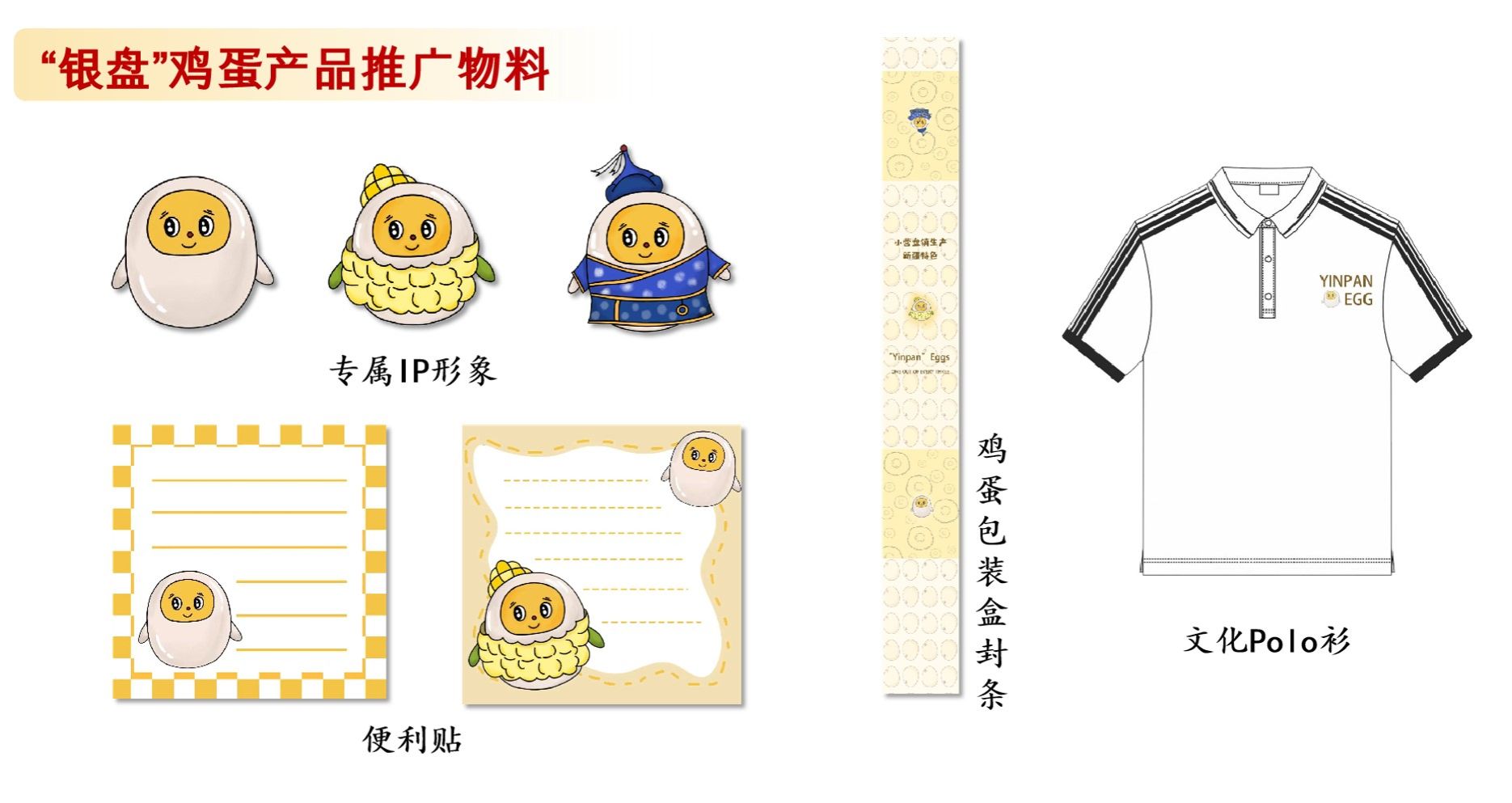 实践队设计的卡通角色以“银盘”鸡蛋为核心元素,巧妙融合当地文化特色,形态各异,活泼可爱。同时,实践队推出了两款创意便利贴、鸡蛋包装盒封条以及特色文化POLO衫等周边产品,玛迪娜表示:“我们的设计初衷在于提升产品的附加价值,让‘银盘’鸡蛋在视觉上实现质的飞跃,从而更加贴近消费者的审美与需求。”