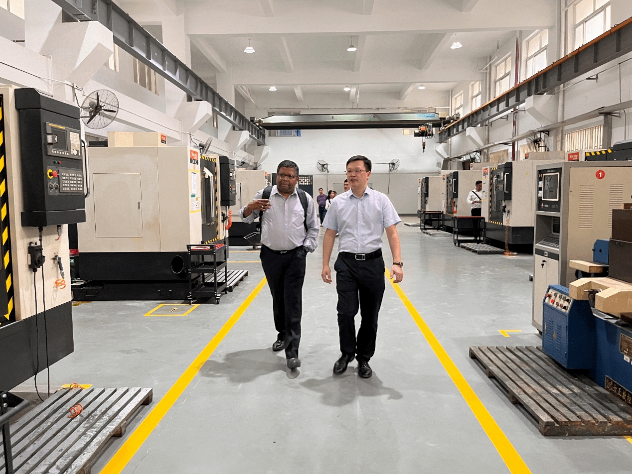 随后,Bas Baskaran一行参观了工业文化长廊、智能制造数字孪生实训室、数控实训室、3D打印实训室和机器人等实训室,了解了各实训室的教学内容,设备配置和师资力量等情况。