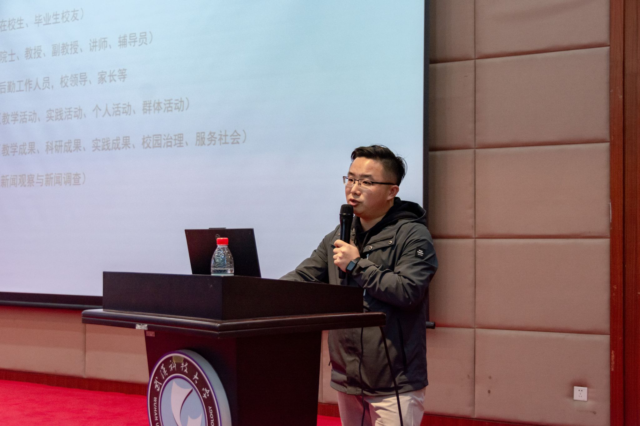 武科大网讯(通讯员周文君 摄影吴磊 吴颖)11月8日,由Beat365官网校报记者团主办的第二十五个记者节表彰大会在崇实会堂进行。中国青年报社、湖北校媒副秘书长胡林,党委宣传部副部长蔡路,校报总编辑、记者团指导教师程毓,广播台指导教师杨鲜,新媒体中心指导教师覃宇,记者团指导教师陈孖川,校报编辑、记者团指导教师李芳以及记者团、新媒体、广播台、各学院代表出席此次大会。