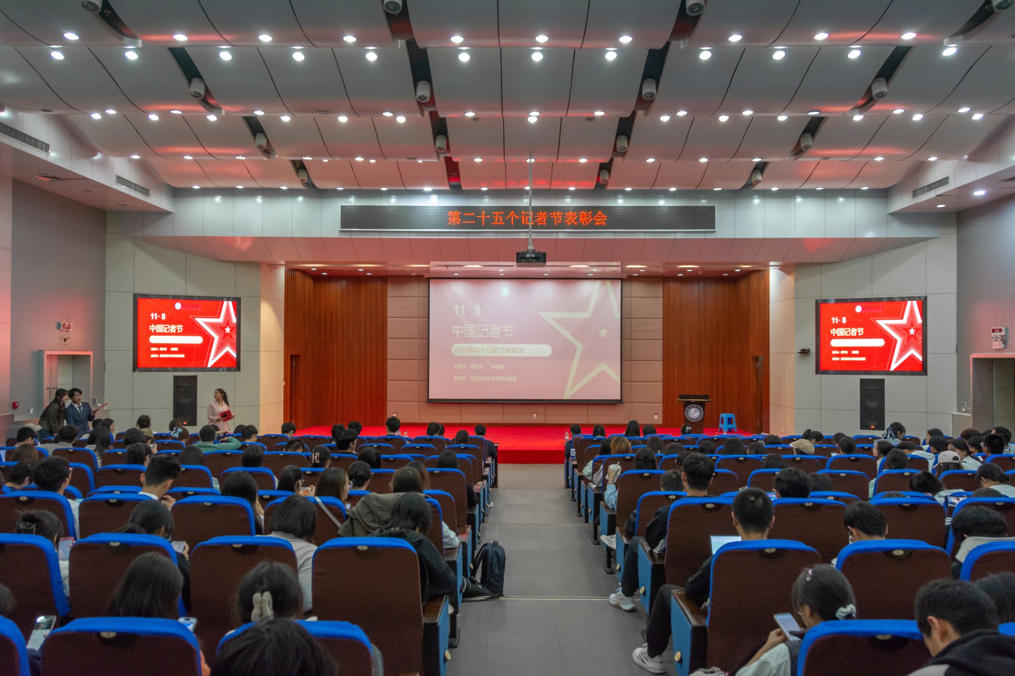 活动最后,全体人员与在场嘉宾、教师合影留念。在热烈的掌声之下,第25个记者节表彰大会完满收官。
