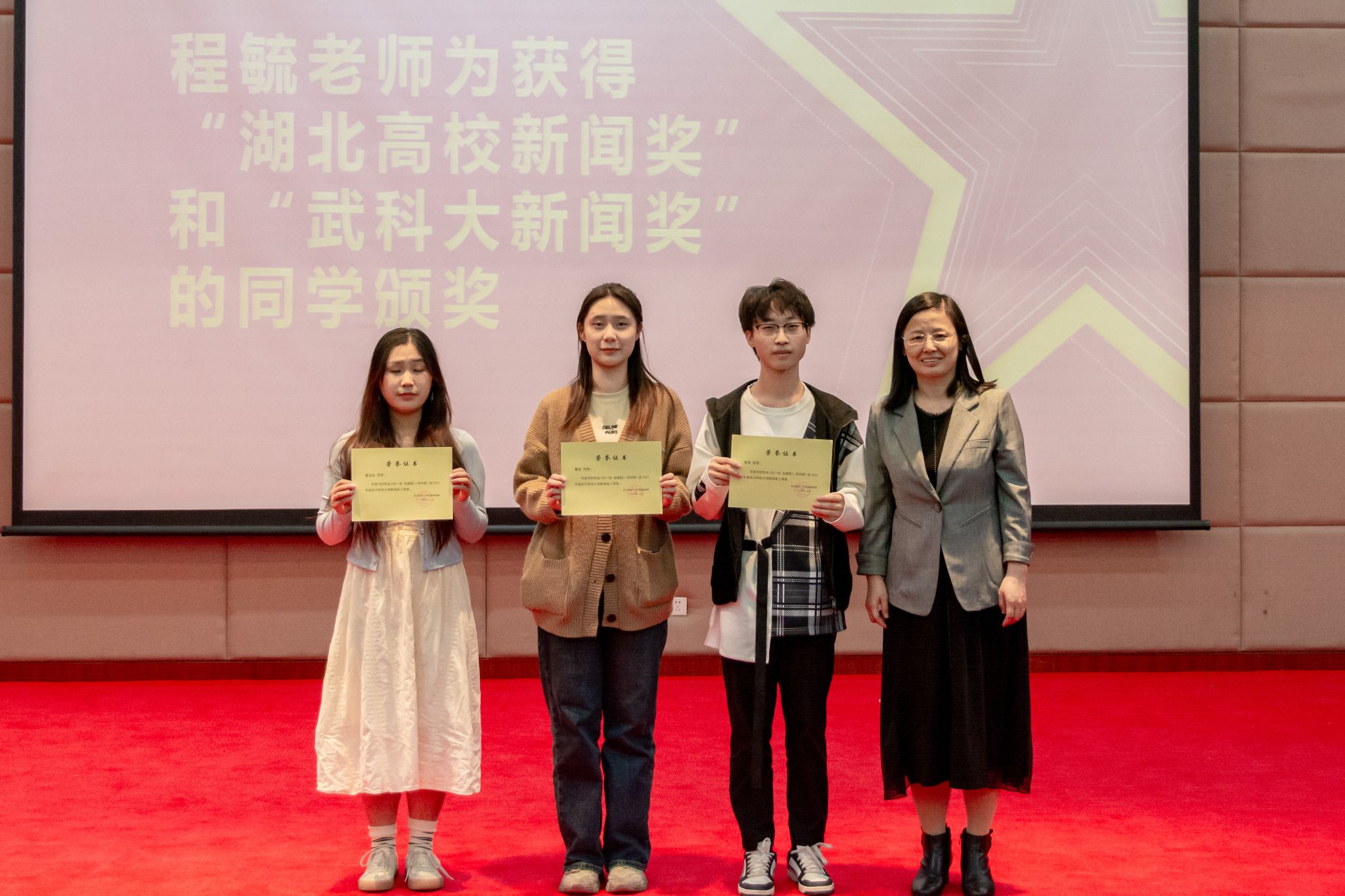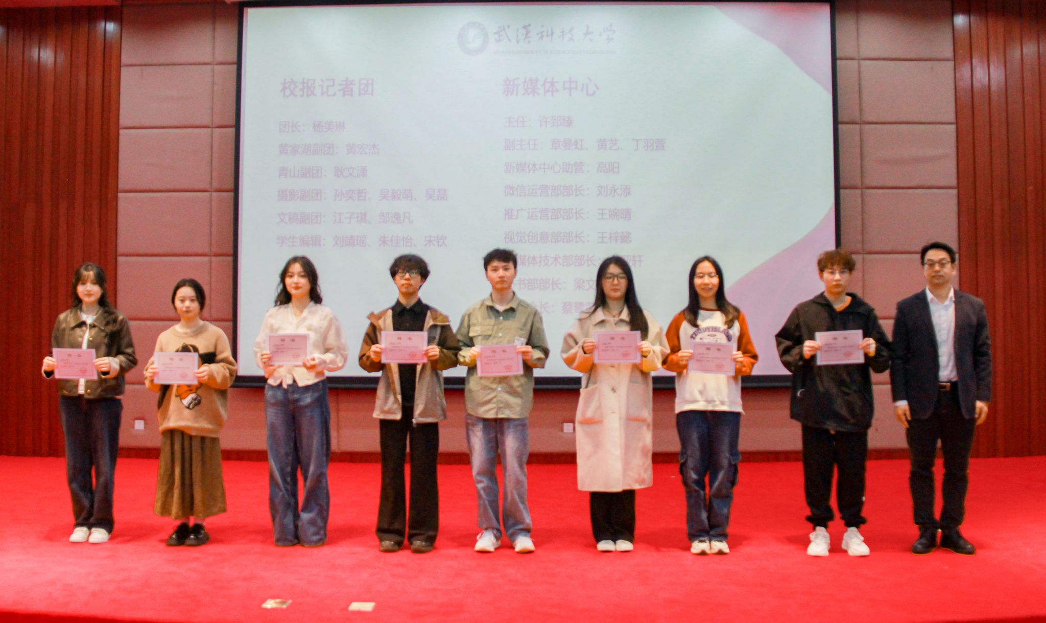 蔡路宣读融媒体中心各团队新一届主席团成员名单并颁发聘书,中国湖北高校传媒协会颁发湖北省年度影响力校园媒体、湖北校媒优秀记者、湖北校媒第12届执行主席证书;程毓为获得“湖北高校新闻奖”和“武科大新闻奖”的学生颁奖;覃宇为新媒体中心“年度十佳创作者”颁奖;陈孖川为短视频中心“优秀成员”颁奖;杨鲜为广播电视台“优秀成员颁奖”。