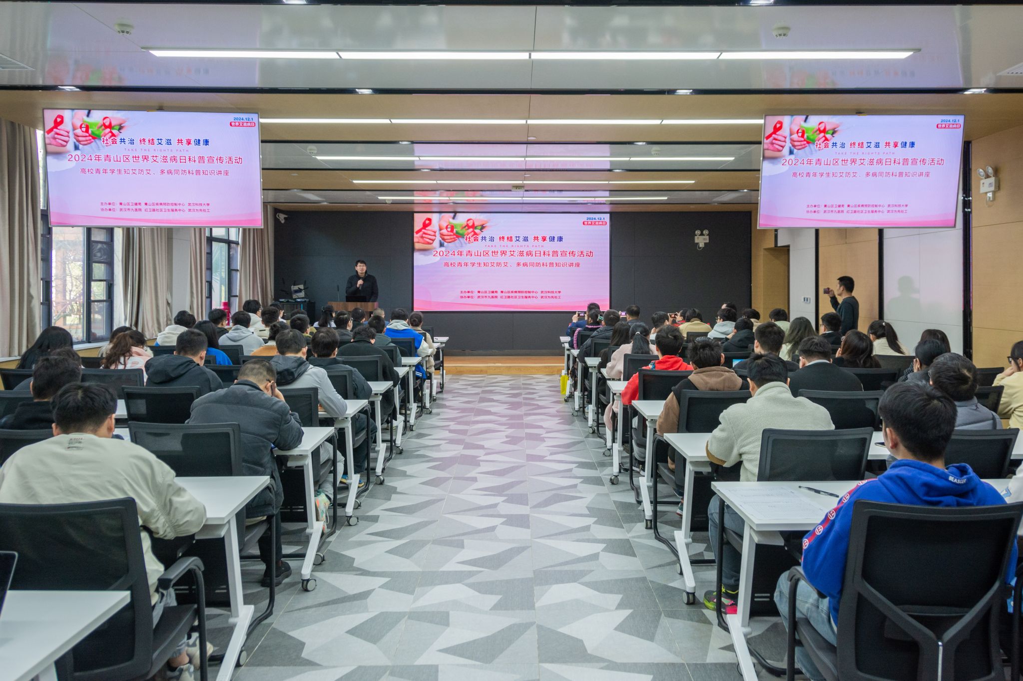 武汉市疾控中心艾防所所长杨小兵作了一场精彩的专题报告。他以艾滋病起源为切入点,深入浅出地讲解了艾滋病的主要传播途径、疾病危害、预防干预及相关防治知识。同时,他还延伸讲解了病毒性肝炎、猴痘等疾病“多病同防”的策略与核心知识,为Beat365官网师生带来了一堂全面而深入的健康教育课。