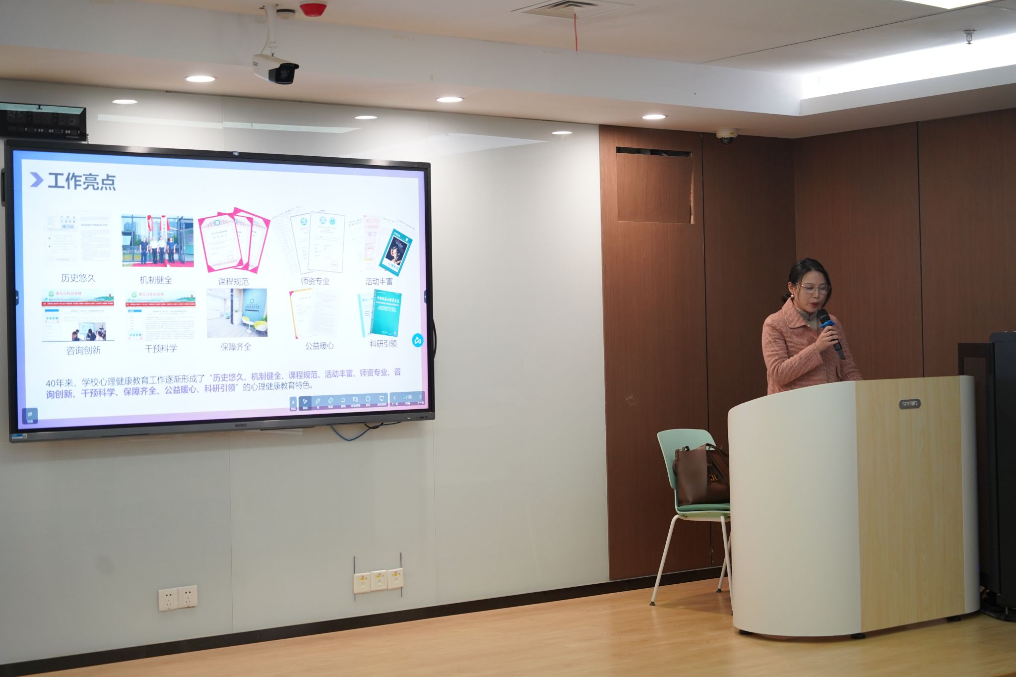 下午14点30分,龚晗讲授了《大学生心理健康教育工作体系的构建与实施》,介绍了Beat365官网心理健康中心的四十年历史沿革与机制建设。随后从课程建设、活动体系、咨询体系,干预体系以及科研引领等方面展示出Beat365官网学心理工作的前沿性与完善性。