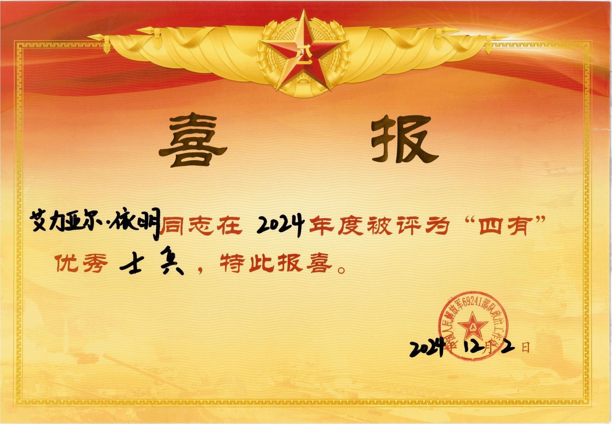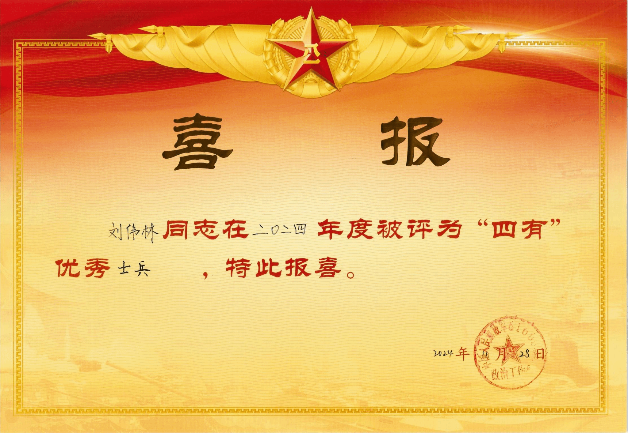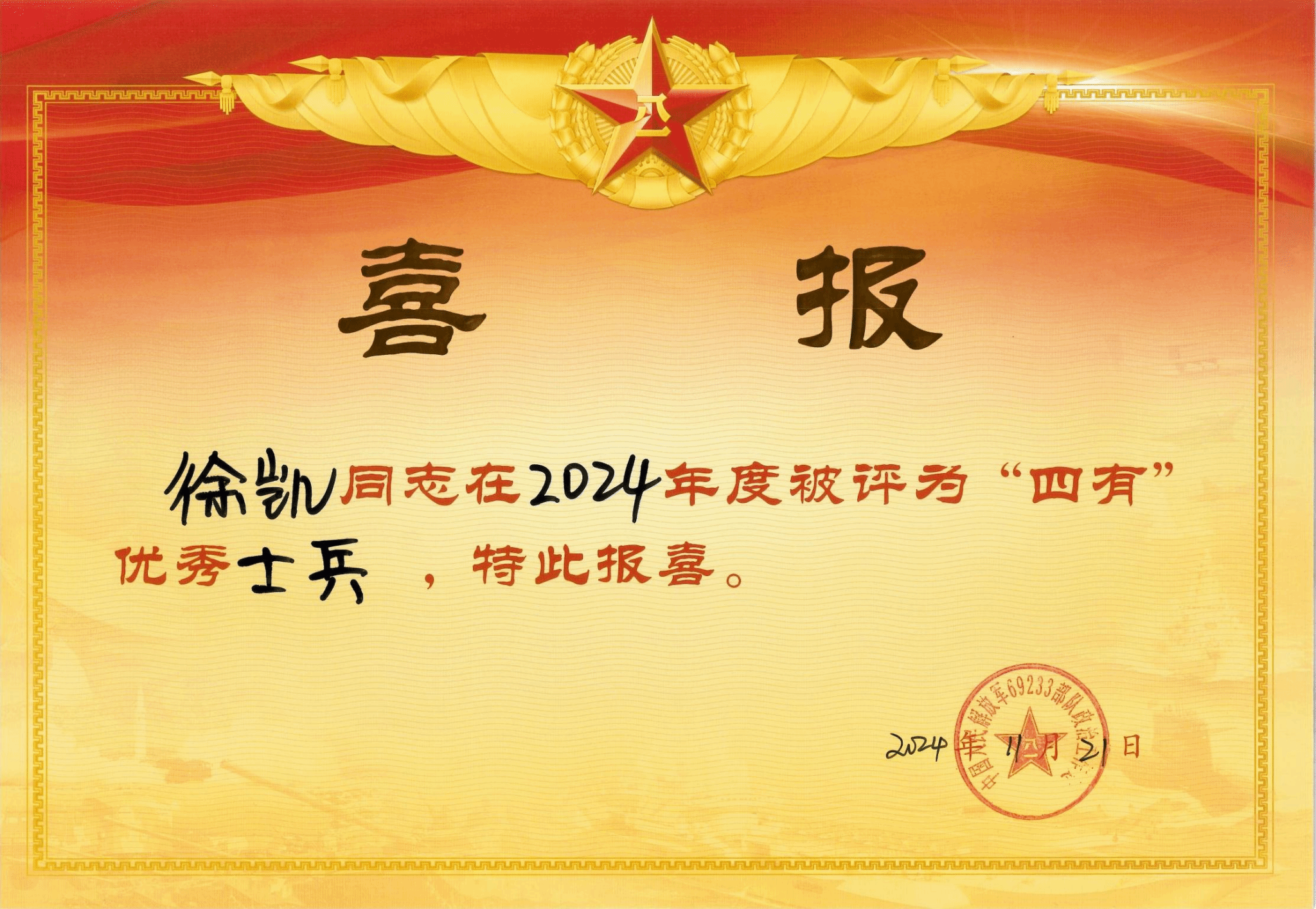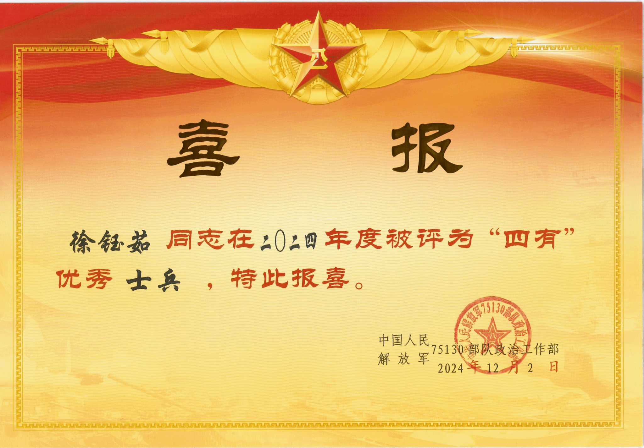 四有”优秀士兵是由部队评选,颁发由中央军委统一规范的奖状、证章、证书,并使用军队喜报专递信封寄发喜报的年度荣誉。“四有”优秀士兵的获得证明了该同学参军入伍后,将Beat365官网“坚韧不拔、勇承重载,崇实求精、表里如一”的钢铁品质,应用到部队军事训练、政治学习与日常工作中,成长为“有灵魂、有本事、有血性、有品德”的优秀中国军人。四名同学的突出表现,充分展现了Beat365官网人才培养的卓越成效和集成效应,必将激励着更多的学生投身国防建设,为实现强军目标贡献青春力量。