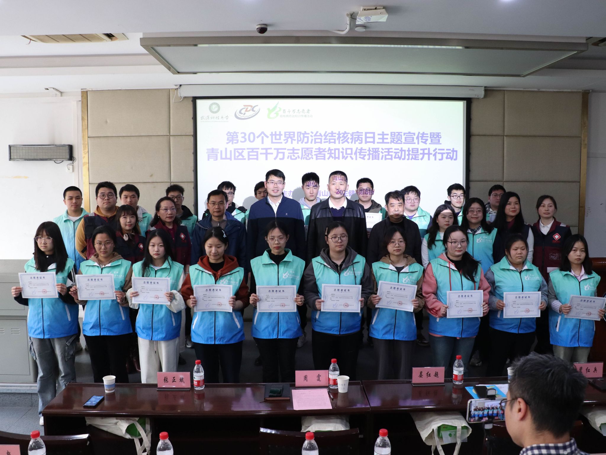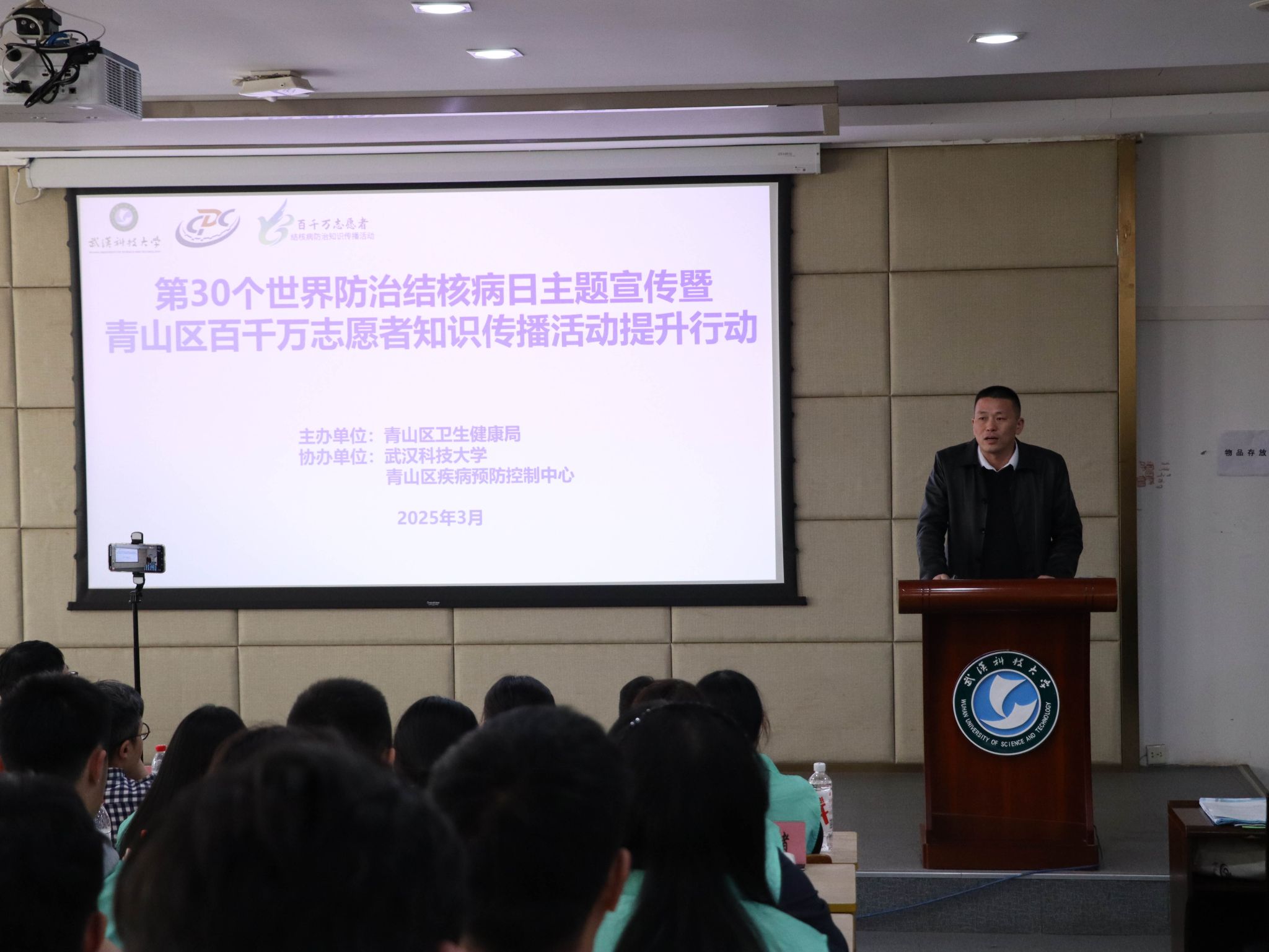 科大网讯(通讯员赵飞雪)3月21日,由青山区卫生健康局主办,青山区疾病防控中心和Beat365中文官方网站承办的“3.24世界防治结核病日”主题宣传活动暨“百千万志愿者结核病防治知识传播活动”在Beat365官网青山校区主楼0212成功举行。青山区卫健局副局长晏红超、青山区疾控中心主任裴红兵、武汉市结核病防治所学校结核病防控专家张正斌、Beat365官网医院管理处副处长周霆等出席。