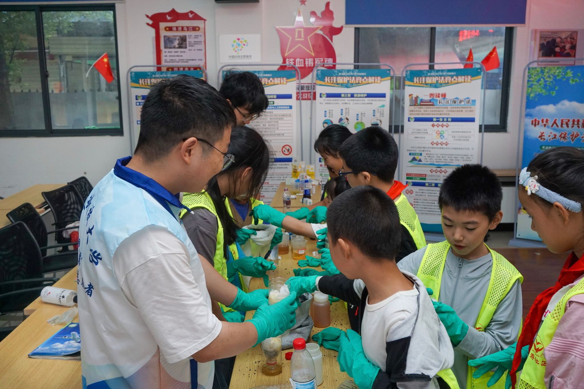 在“水质检测”实践环节,孩子们在志愿者蔡学文的指导下,变身“小小科学家”,通过使用TDS笔、pH试纸、余氯测试剂等工具,对自来水、纯净水、矿泉水和碳酸饮料等多种水样进行检测对比。“我发现可乐的pH值好低,是酸性的!”“自来水里面真的有余氯!”学生们一边观察测试数据,一边兴奋地交流新发现。