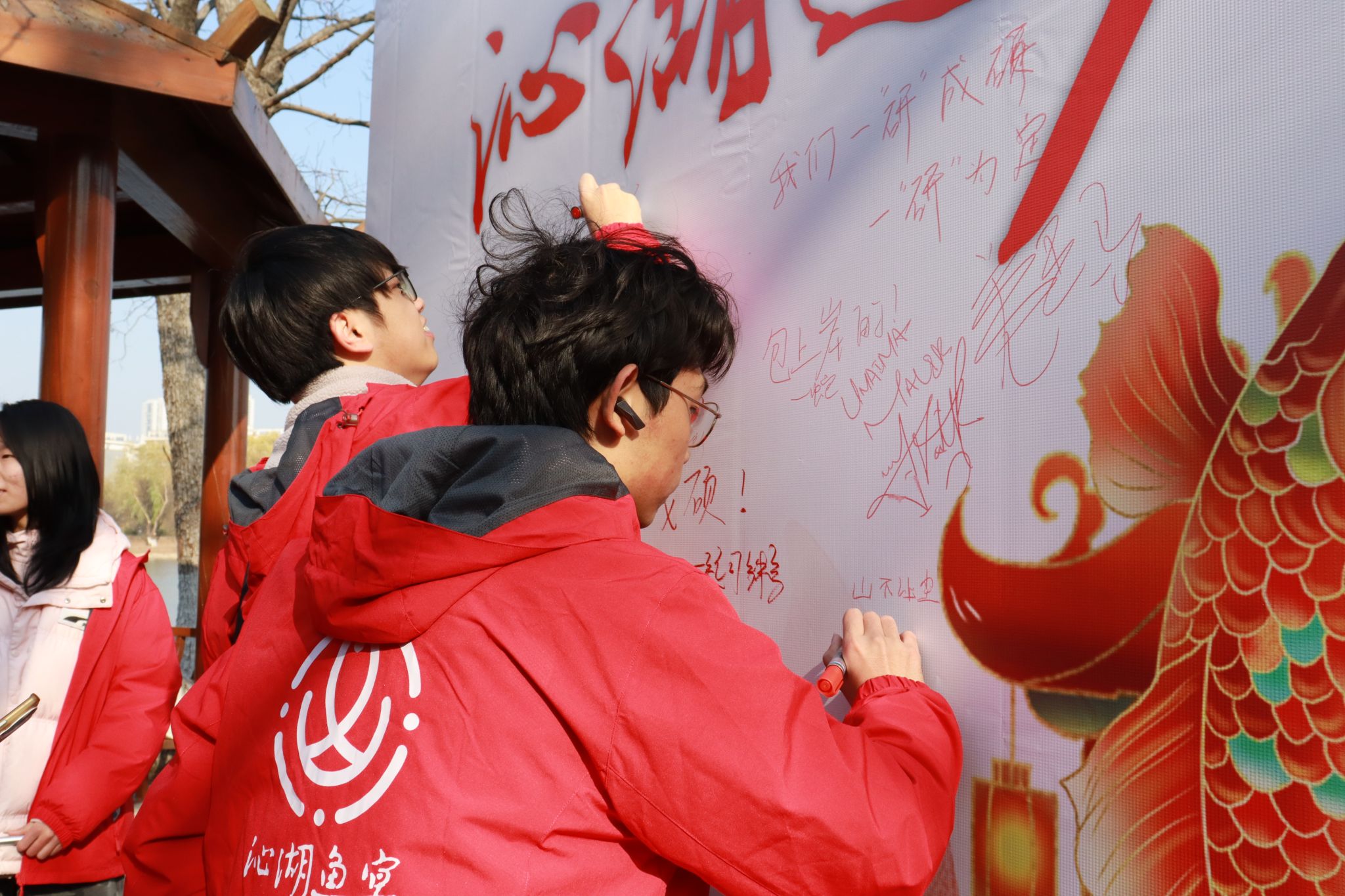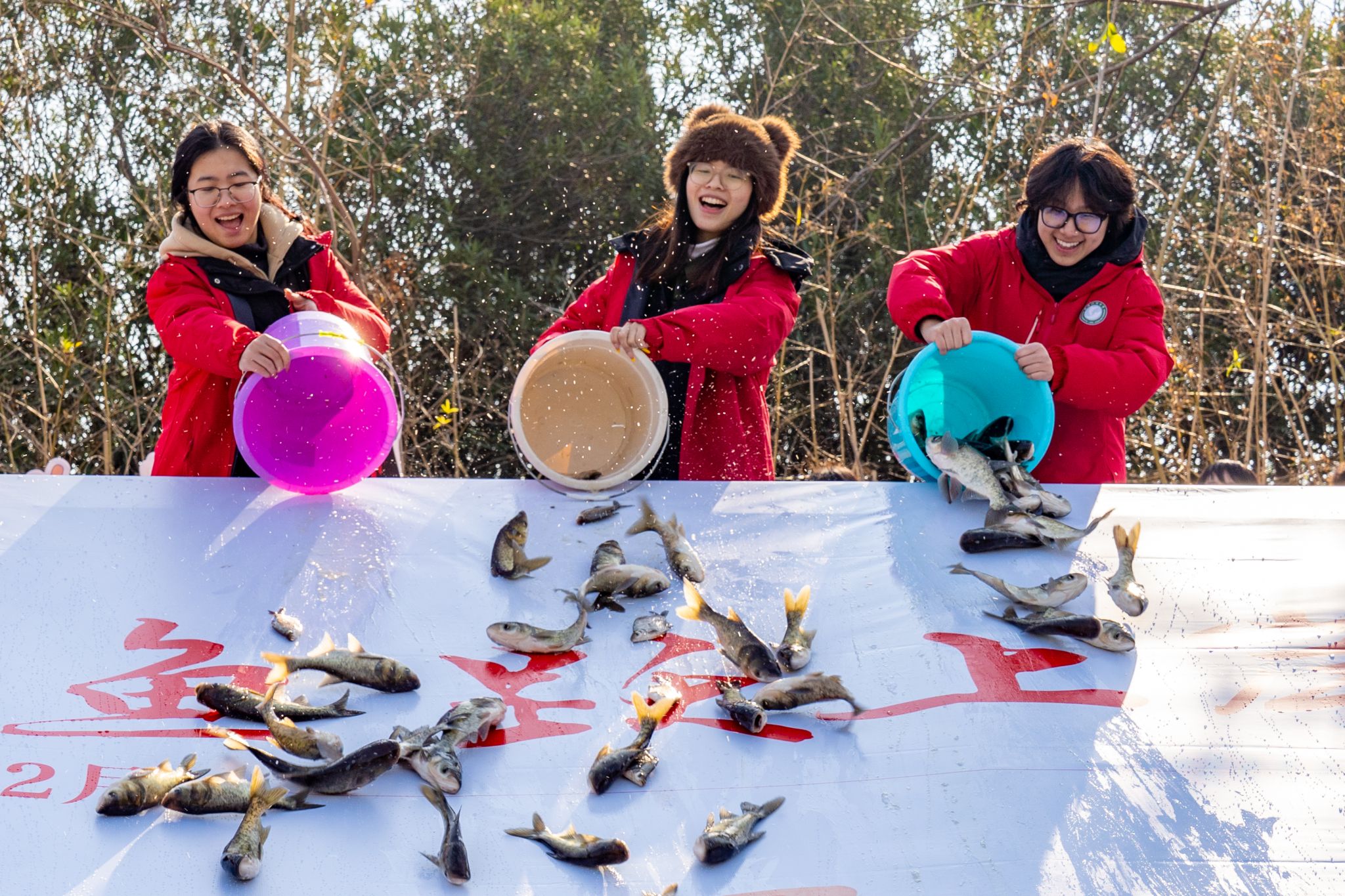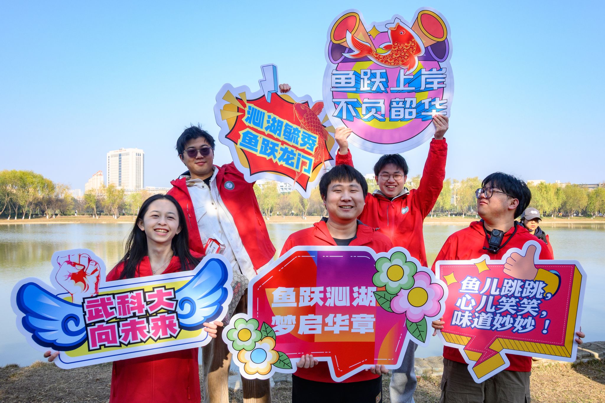 活动现场,近百人聚集在沁湖旁,将祝福和心愿写在留言板上。随后是热烈的歌舞环节,应景的歌曲《好运来》,充满异域风情的舞蹈……伴随阵阵铿锵有力的鼓点,放鱼环节隆重开启,42名学子将5000余尾鱼投送沁湖,现场爆发出阵阵欢呼。