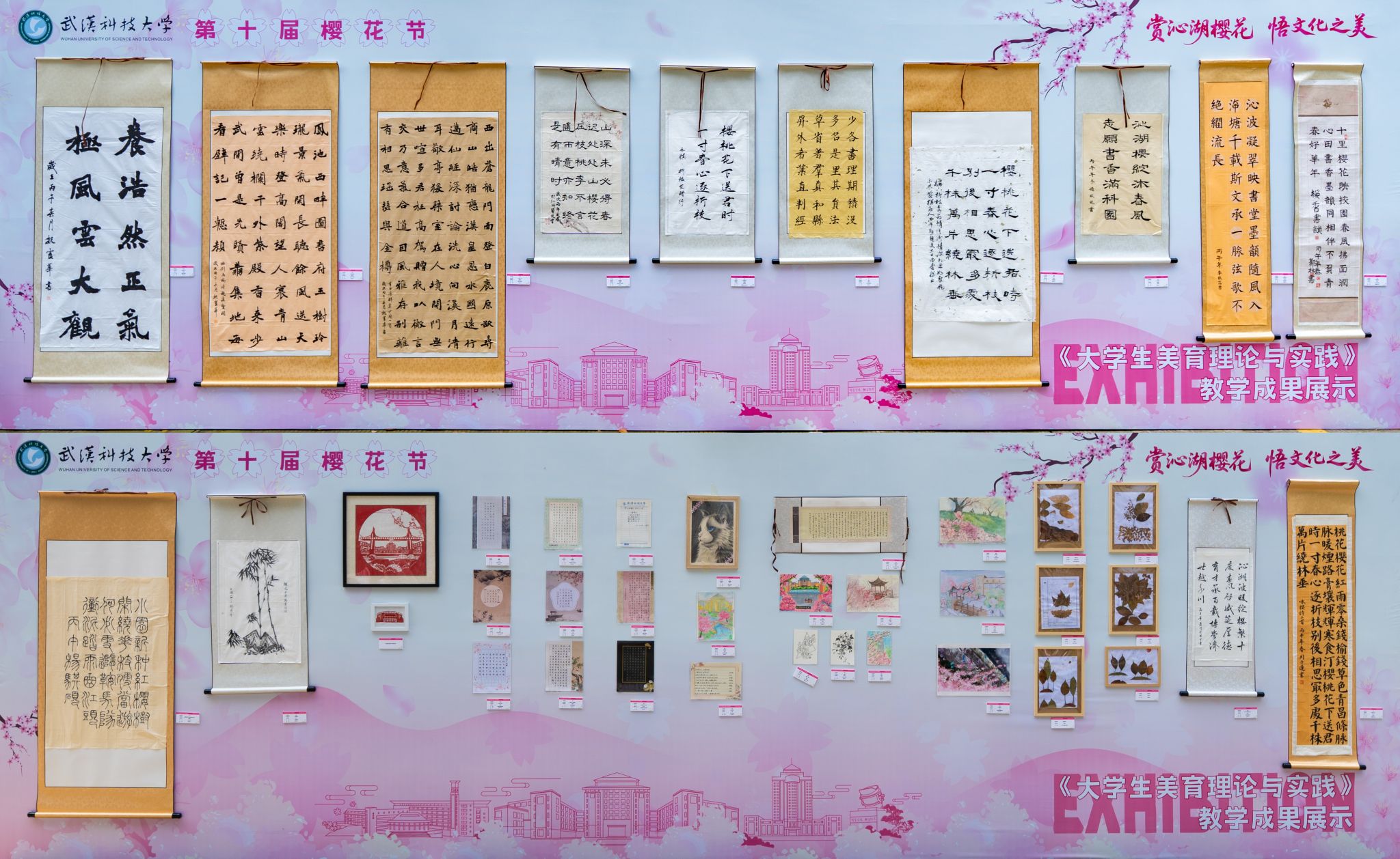 樱园旁设有“樱墨丹青——美育作品展”展区。展出的书法、树叶剪贴画、剪纸、刺绣等作品多由在校师生创作,集中呈现学校美育实践的教学成果。“作品展不仅彰显了学校美育工作的成就,更能激发同学们发现美、创造美的热情。”党委学生工作部副部长杨永彬在参观时表示。