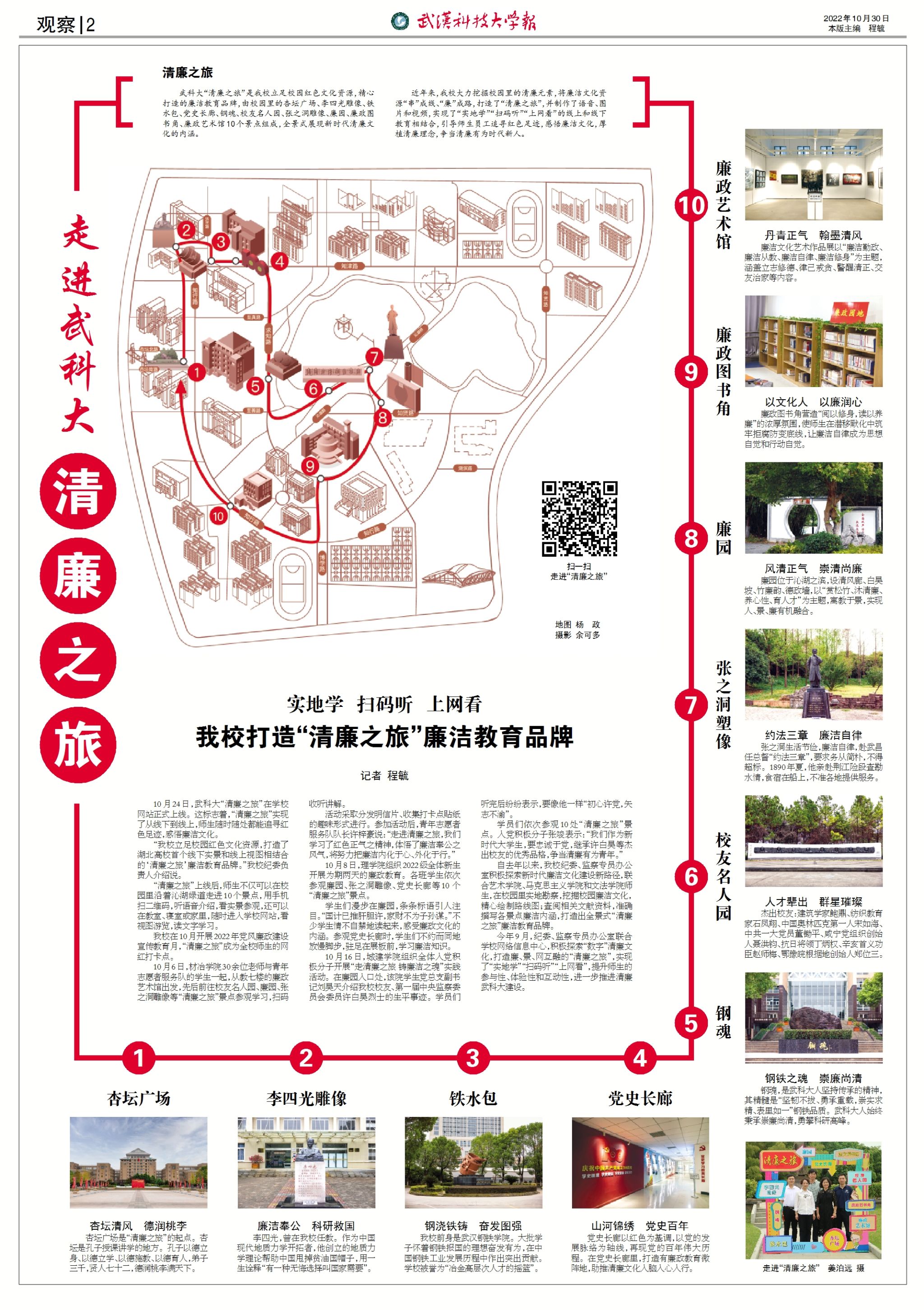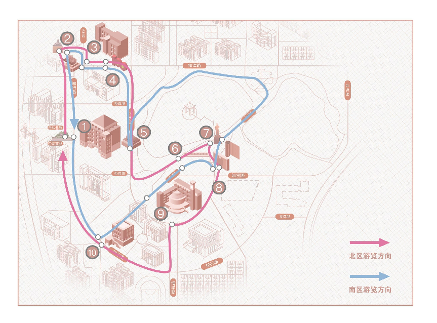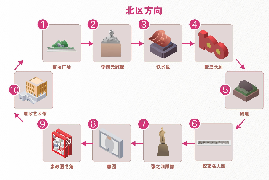 北区路线:杏坛广场——李四光雕像——铁水包——党史长廊——钢魂——校友名人园——张之洞雕像——廉园——图书馆廉政文化会客厅——廉政艺术馆——清廉有为师生之家