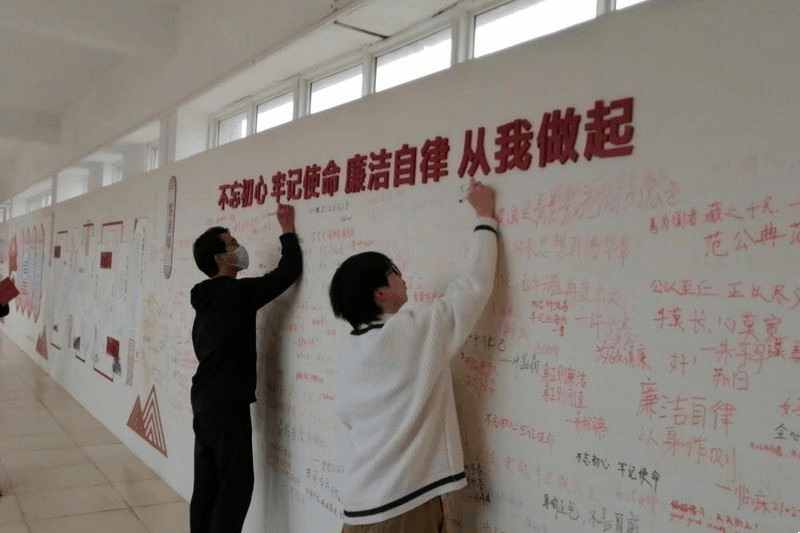 山河锦绣 党史百年 党史教育长廊以红色为基调,以党的发展脉络为轴线,用一个个光辉的红色时间节点,让师生循着时间脉络走入百年历史长河,再现中国共产党的伟大历程。在长廊里打造有廉政教育微阵地,助推清廉文化入人心。